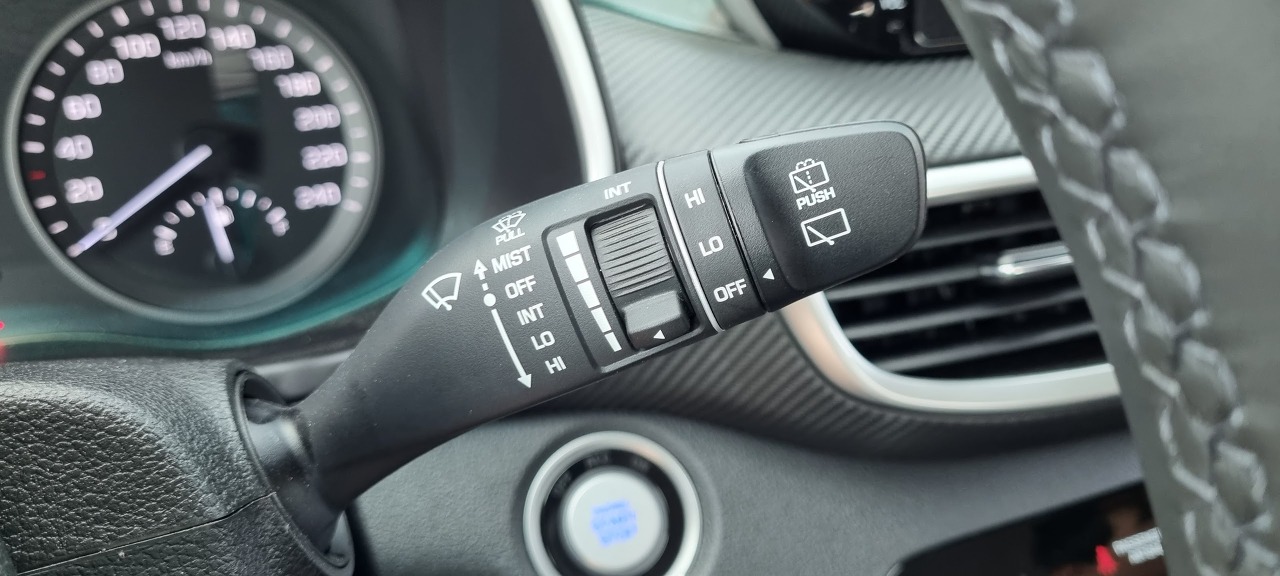 스티어링 휠 뒤쪽에는 조명과 와이퍼를 조절할 수 있는 레버가 있다. 레버의 조작감이나 위치는 평범한 수준이다. 플래티넘 옵션이나 인스퍼레이션 등급에는 레인 센서가 장착되어 있지만 해당 차량에는 빠져있다.