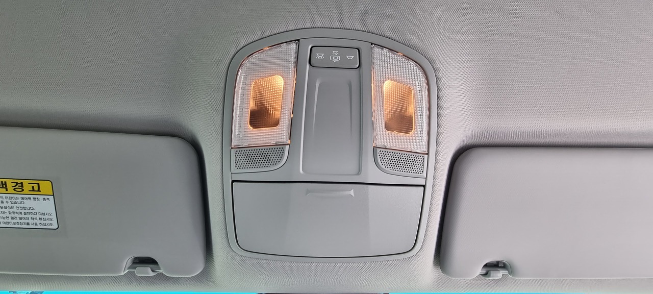 천장 앞부분에는 1열 전용 조명과 선글라스 케이스로 구성되어 있다. 튜익스 옵션 중 LED 패키지를 넣으면 전구가 아닌 LED로 장착된다. 최신 차량에는 잘 보이지 않는 선글라스 케이스가 반갑다.