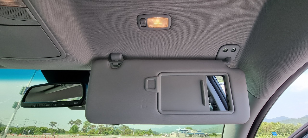 선바이저 위쪽에는 ON / OFF 스위치로 된 작은 조명이 위치해있다. 전에 아베오 탈 때 저걸로 2열 LED 조명을 달았었는데 여기서 다시 보니 반갑다. 선바이저에는 운전석 / 조수석 모두 슬라이딩 커버를 장착한 화장 거울이 달려있다.