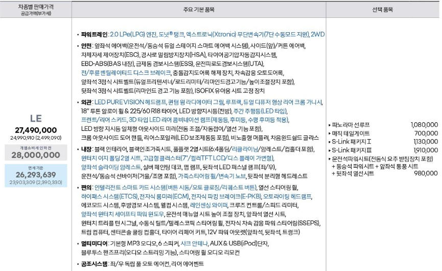 더 뉴 말리부는 SUV가 아닌 세단이니까 제대로 된 비교는 아니지 않냐고 반박할 수도 있다. 그래서 르노 코리아의 중형 SUV인 QM6 LPe LE 트림을 기준으로 가격을 맞춰보았다. 아래는 QM6 LE 트림의 기본 가격표이다. 여기에 시트 옵션을 추가하여 98만 원을 추가하면 2,847만 원으로 니로 2보다 48만 원이 저렴하다.