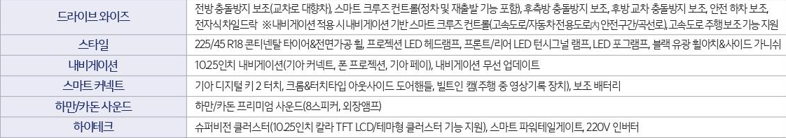 출력, 승차감, 정숙성, 내부 공간, 전좌석 자외선 차단 유리, BOSE 9개 스피커, 무선 프로젝션 헤드 유닛, 후측방 경고 시스템, 사각지대 경보 시스템, 전방 주차 센서, 액티브 노이즈 캔슬링, 조수석 무릎 에어백, 2열 사이드 에어백, 천연 가죽 시트, R-EPS 조향 시스템, 17인치 알로이 휠, 8인치 LCD 계기판, 1열 8방향 전동 시트, 운전석 메모리 시트, 트림별 인조 가죽 마감, 후진 시 사이드미러 자동 하향 기능, 발렛 파킹 모드