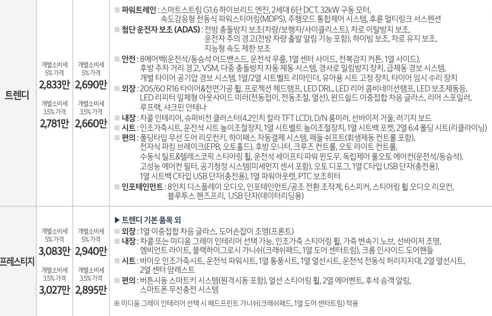 위의 표를 기준으로 더 뉴 말리부 프리미어 트림과 니로 2 프레스티지 트림의 구성을 비교해보면 아래와 같다.