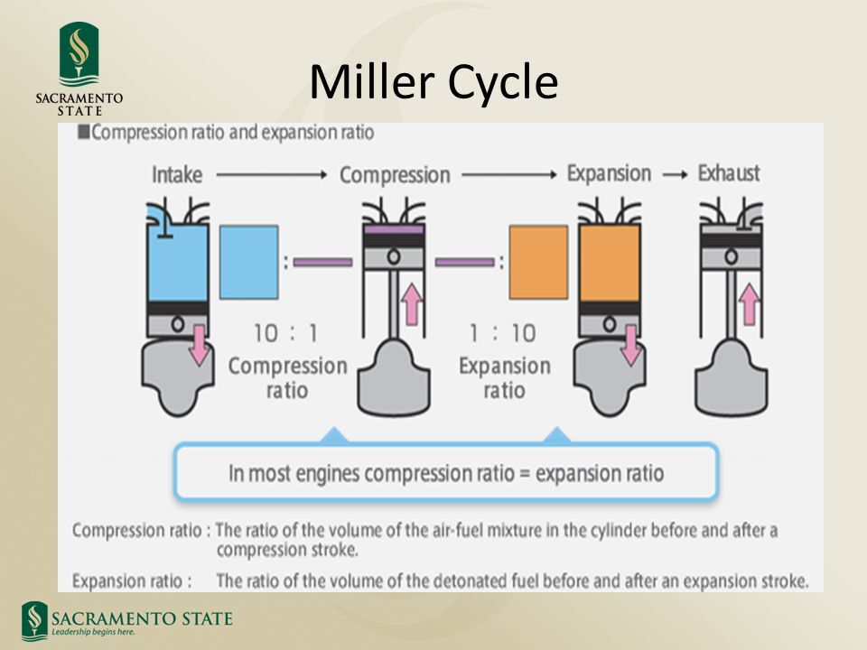 또한, 하이브리드 자동차에서 주로 사용하는 앳킨슨 사이클 방식 (밀러 사이클에 더 가까운 구조이지만 제조사에서 앳킨슨 사이클이라고 명시함) 은 밸브 타이밍을 조절하여 연료 효율을 극대화하는 구조이지만, 그에 따라 실린더 내 압축비가 일반 엔진보다 적어 출력과 토크가 부족한 단점을 가지고 있다.