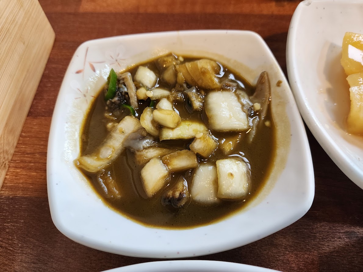 전복 돌솥밥 사진. 게우젓을 넣어 비벼 먹었는데 먹을만했다. 참고로, 오른쪽 사진에 있는 게우젓은 500g에 4만 원이나 하는 매우 비싼 젓갈이다. (왜 비싼지는 모르겠다...)