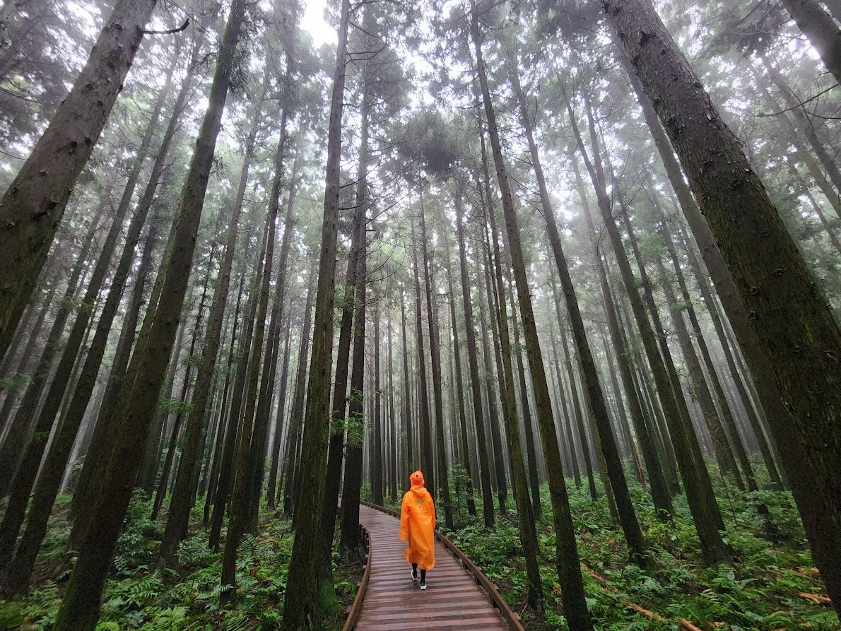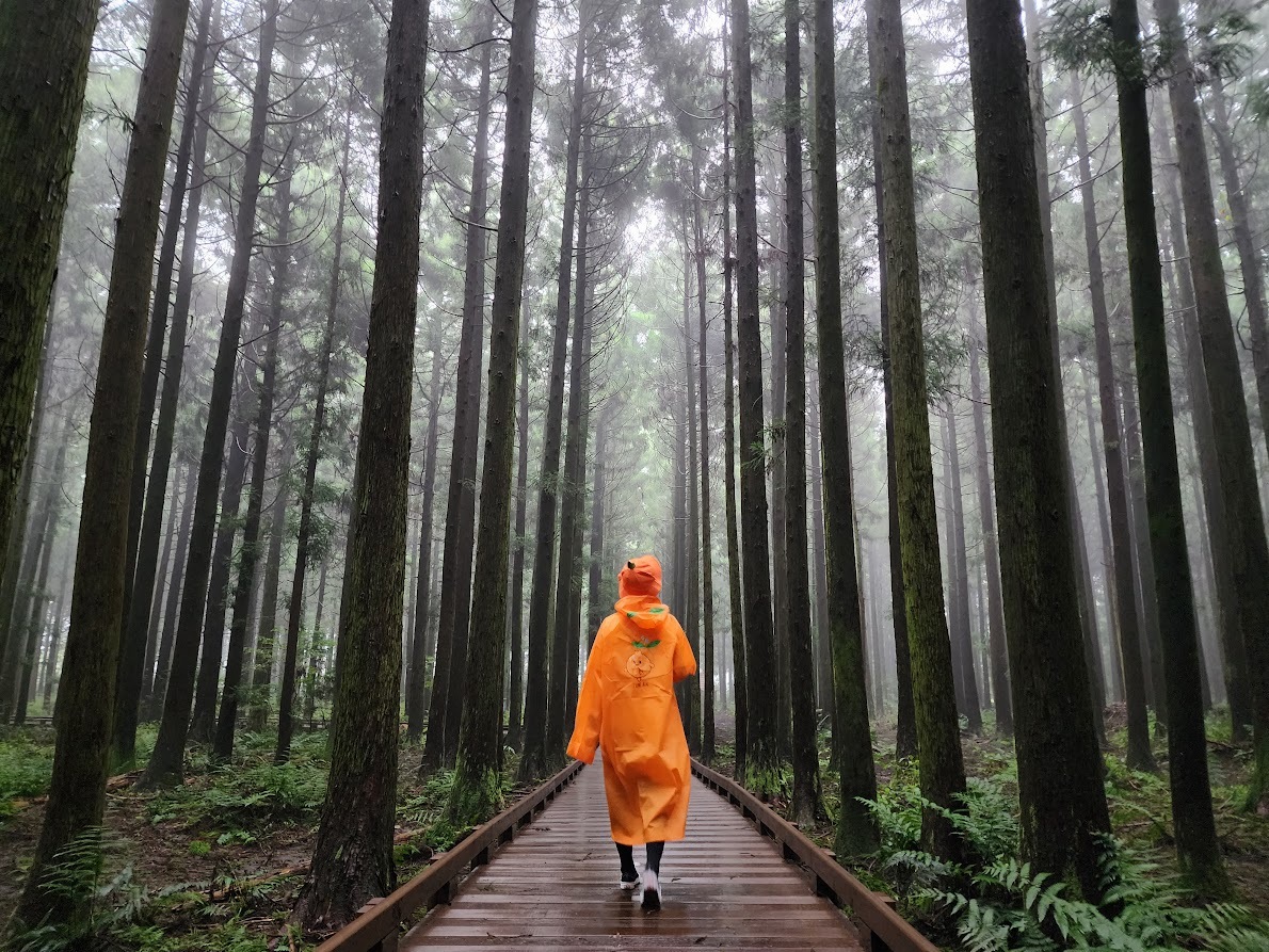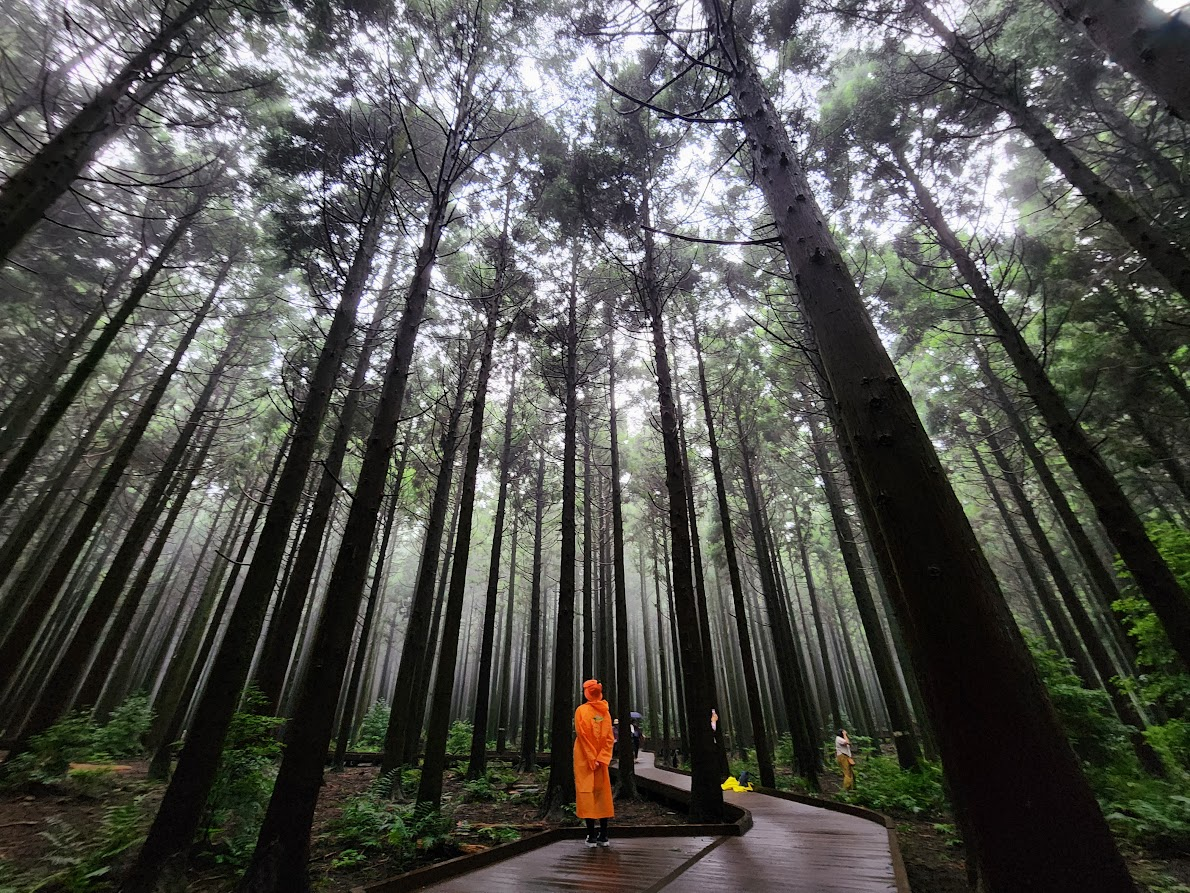 숲에 들어가 보니 왜 신성한 숲이라고 불리는지 알 것 같았다. 빼곡하게 자라 있는 높은 제주 삼나무와 분위기 있게 피어 있는 안개가 신성한 분위기를 자아낸다.