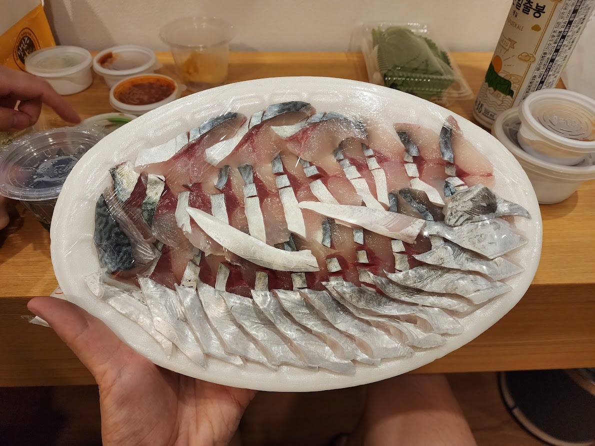 함덕 해수욕장에서 너무 많은 시간을 써버려서 아쉽게도 식당에서는 저녁 식사를 할 수 없었다. 그래서 고등어회와 갈치회를 포장해 가기로 결정!! 이후에 숙소에 돌아와서 포장한 고등어 / 갈치회를 먹었다.