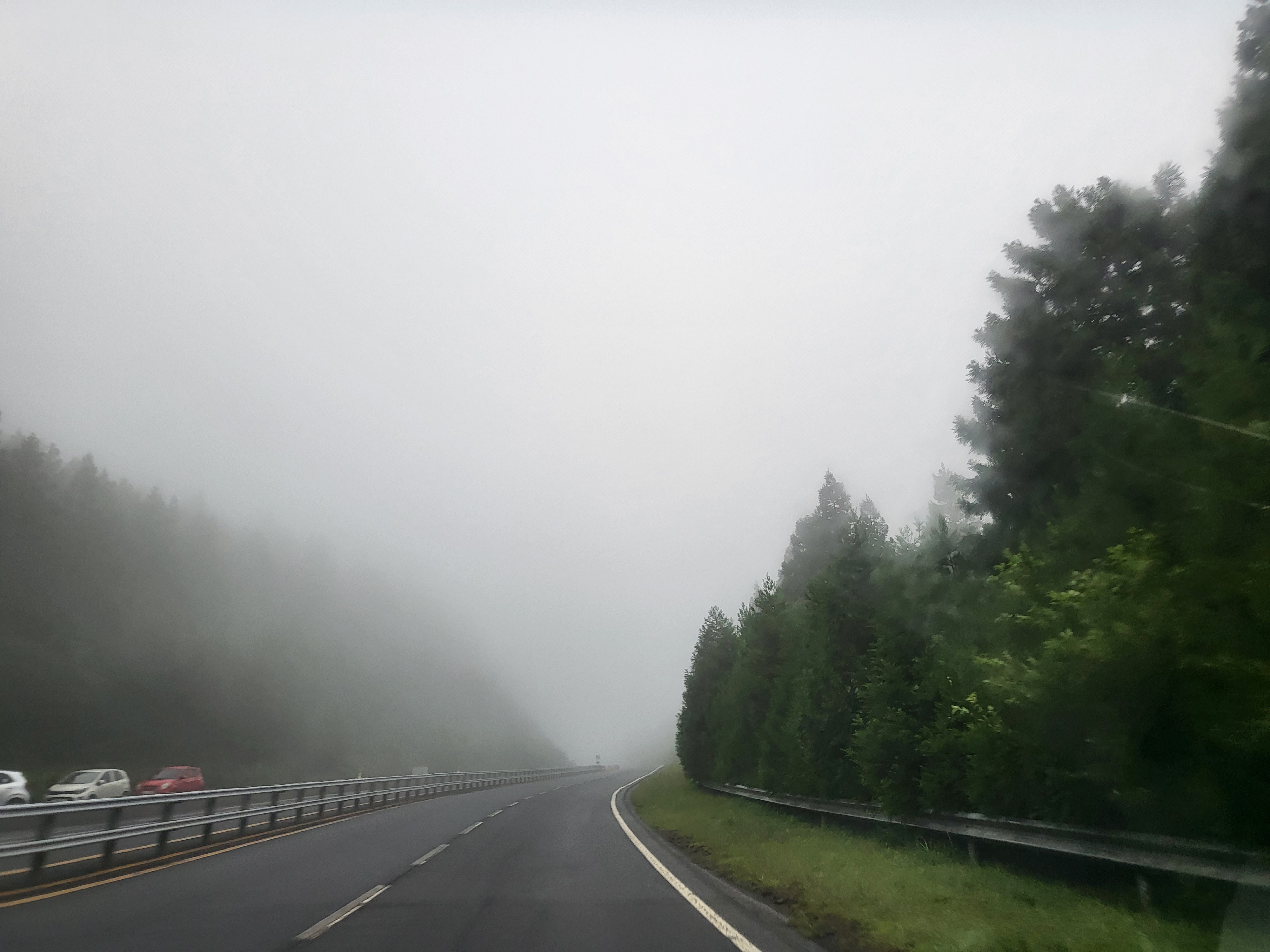 화조원을 떠난 지 얼마 되지 않아 하늘에 먹구름이 끼기 시작했다. 정확하게는 제주도 서쪽의 날씨는 맑고 청명한 하늘이 보였으나, 동쪽의 날씨는 구름이 잔뜩 끼고 비가 내리는 날씨가 계속되었다. 사려니 숲은 한라산 중턱에 위치해 있어 평균 고도가 550m로 높은 편이라 사려니 숲에 다 와갈수록 도로에는 심한 안개가 끼기 시작했다.