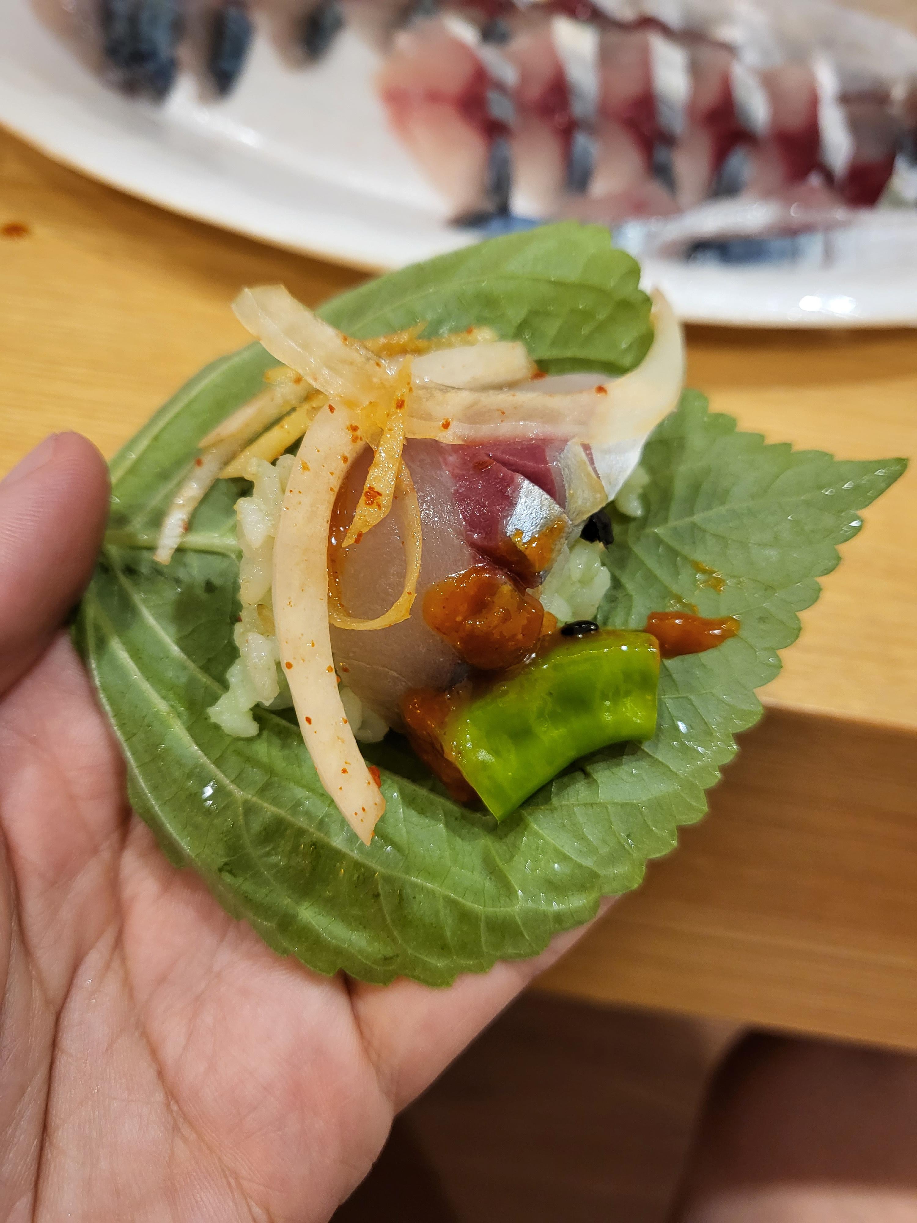 가게에서 알려준 대로 깻잎에 싸서 먹어보니 입에서 사르르 녹았다. 특히, 갈치회가 일품!! 왜 이렇게 사람들이 제주도에 가면 꼭 고등어와 갈치회를 먹어보라고 당부했는지 알 것 같았다.