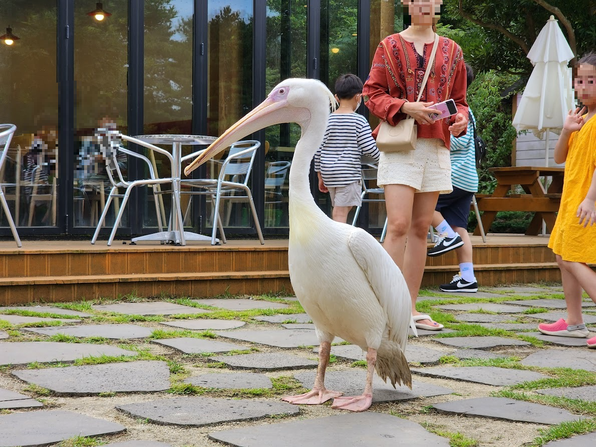 공연이 끝나면 펠리컨은 화조원 내에 있는 카페 주변을 어슬렁 거리면서 산책한다고 한다. 개 웃김. 저러다 지치면 아까 화조원 팻말 아래에서 낫 잠을 잔다.