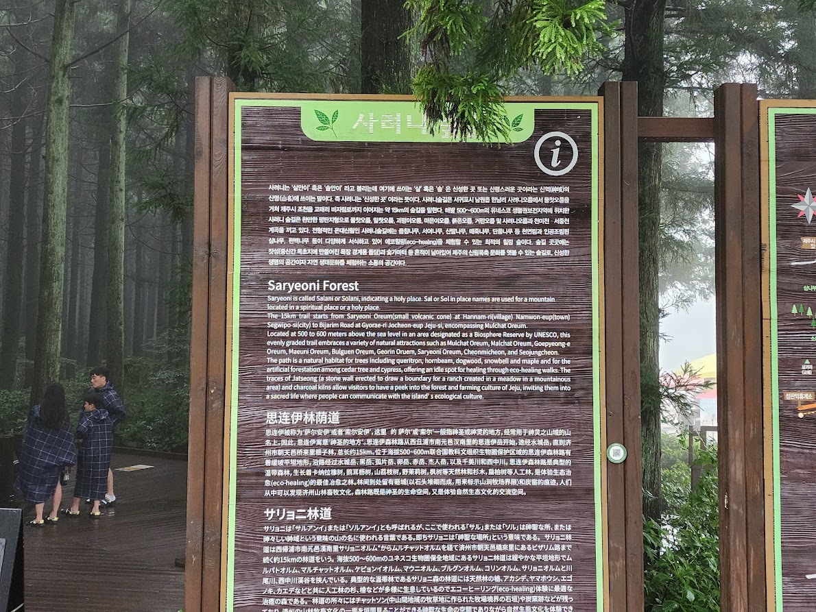 사려니 숲길 입구에 있는 숲에 대한 안내판. 사려니 숲의 의미는 "신성한 숲" 이라는 뜻이라고 한다.