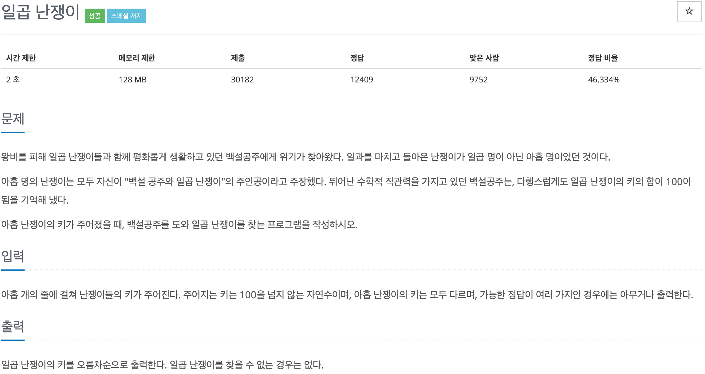완전 탐색에는 순열, 부분 집합, 조합이 있으며, 이번 문제는 9개의 숫자중 7개의 숫자를 선택해서 모두 더한 값이 100이 되는 경우의 수를 찾는 문제다.