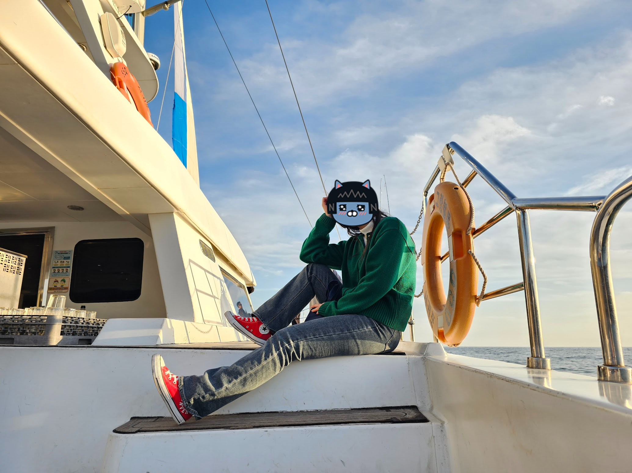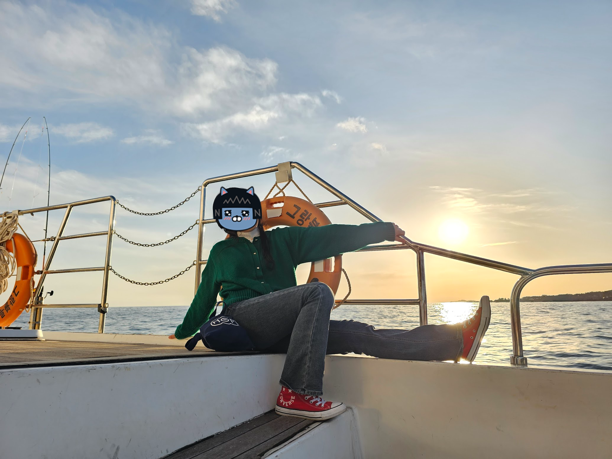 석양을 보며 폼을 잡아봤지만 이미 뒤집어진 내 뱃속. 사진을 찍는 와중에도 빨리 내리고 싶었다. 다행히도 속에 있는 것을 게워내지 않고 (?) 무사히 항구에 도착했다.