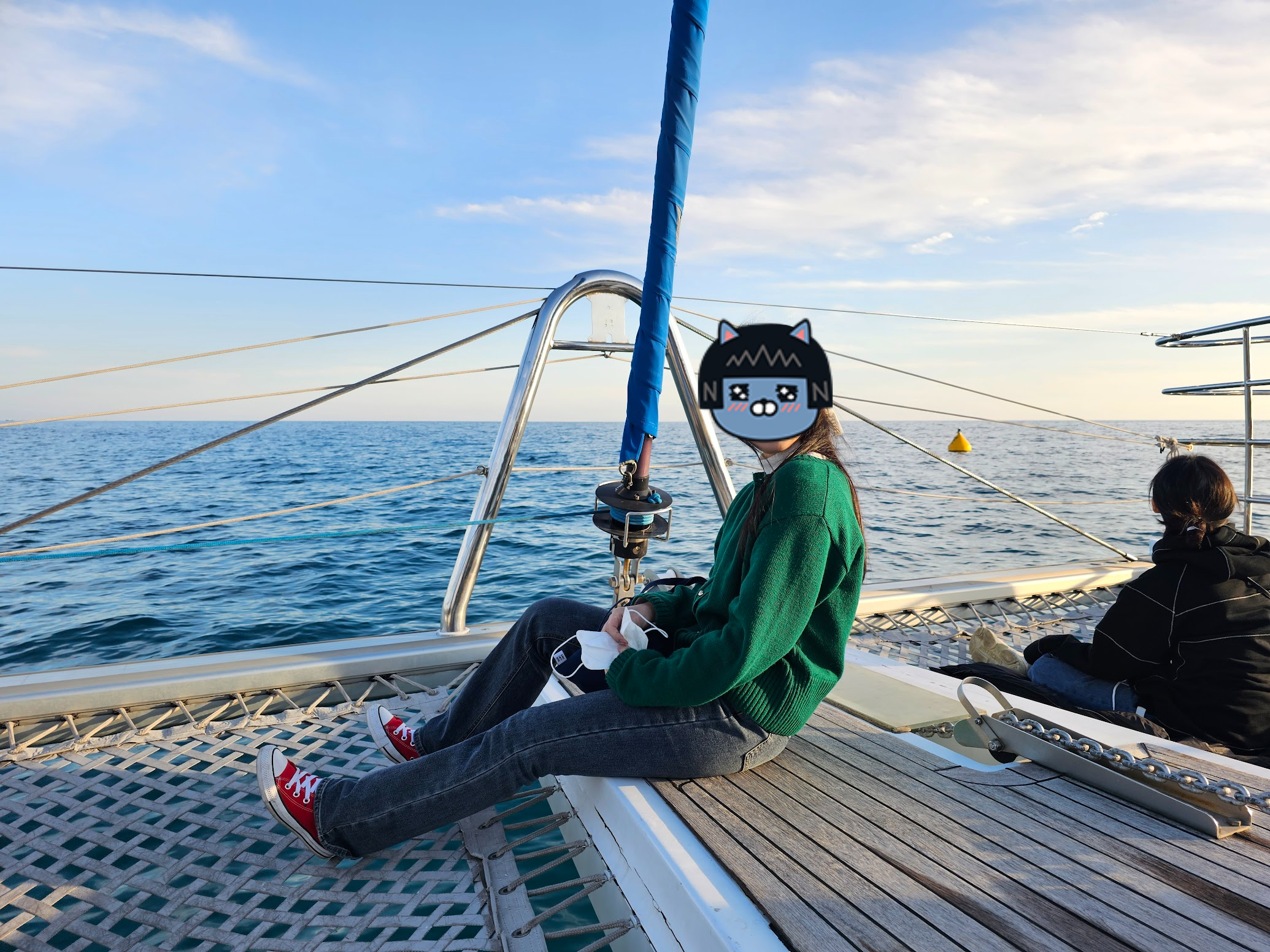 매연을 피해 보트 앞으로 향했다. 아래에 뻥 뚫린 해먹이 걸려 있었는데, 파도가 생각보다 높아서 잘못하면 옷이 젖을 수도 있을 것 같았다.