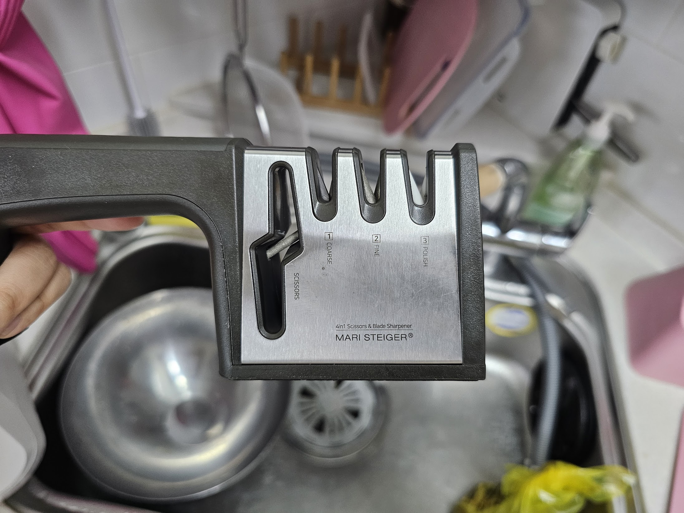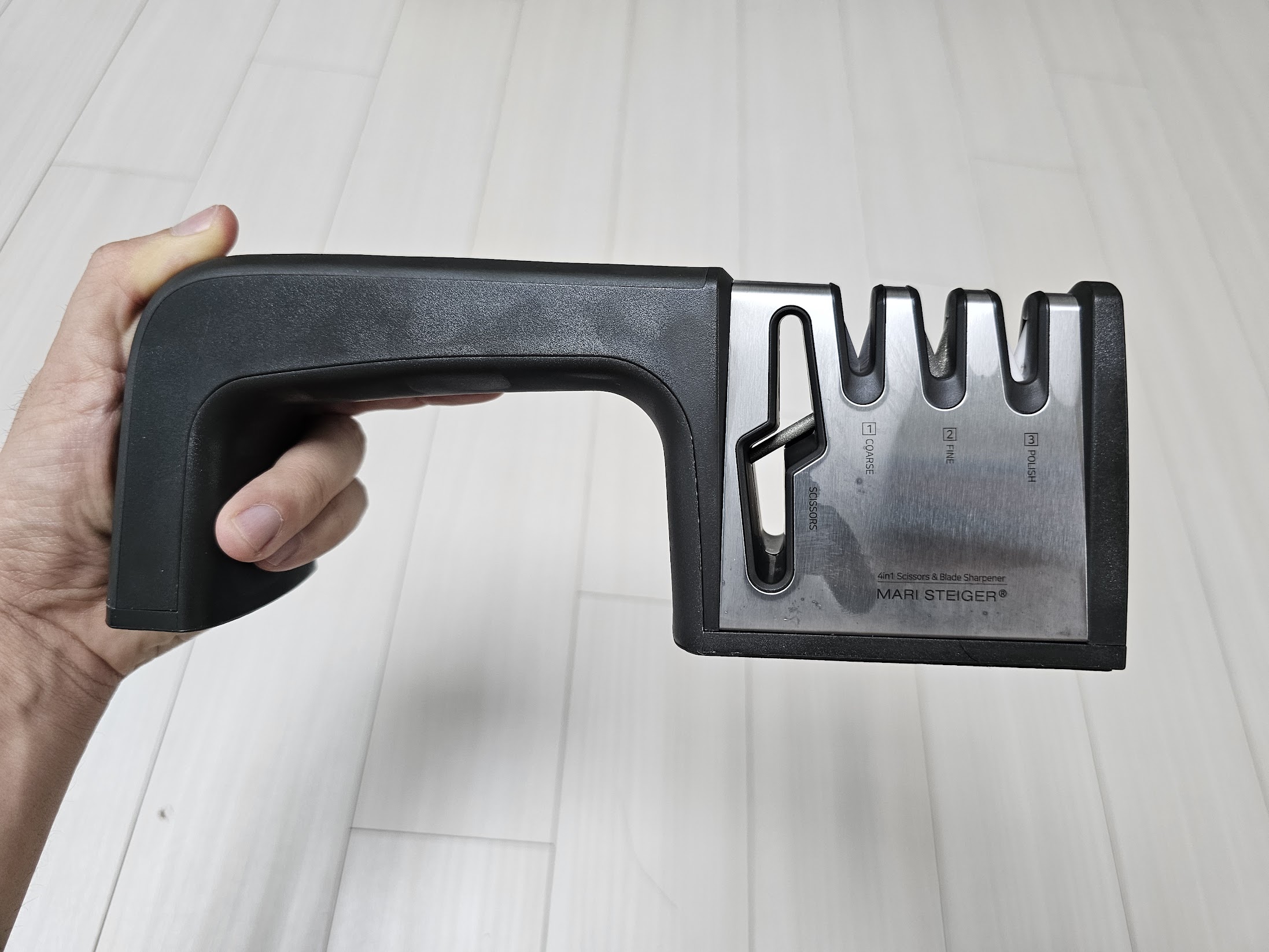 마리 슈타이거 멀티 칼갈이는 위에서 잠깐 언급했지만 가위의 칼날도 갈 수 있다. 주의 사항은 칼을 갈 때와는 반대로 칼날을 안쪽으로 밀 때 힘을 줘야 한다는 것이다.