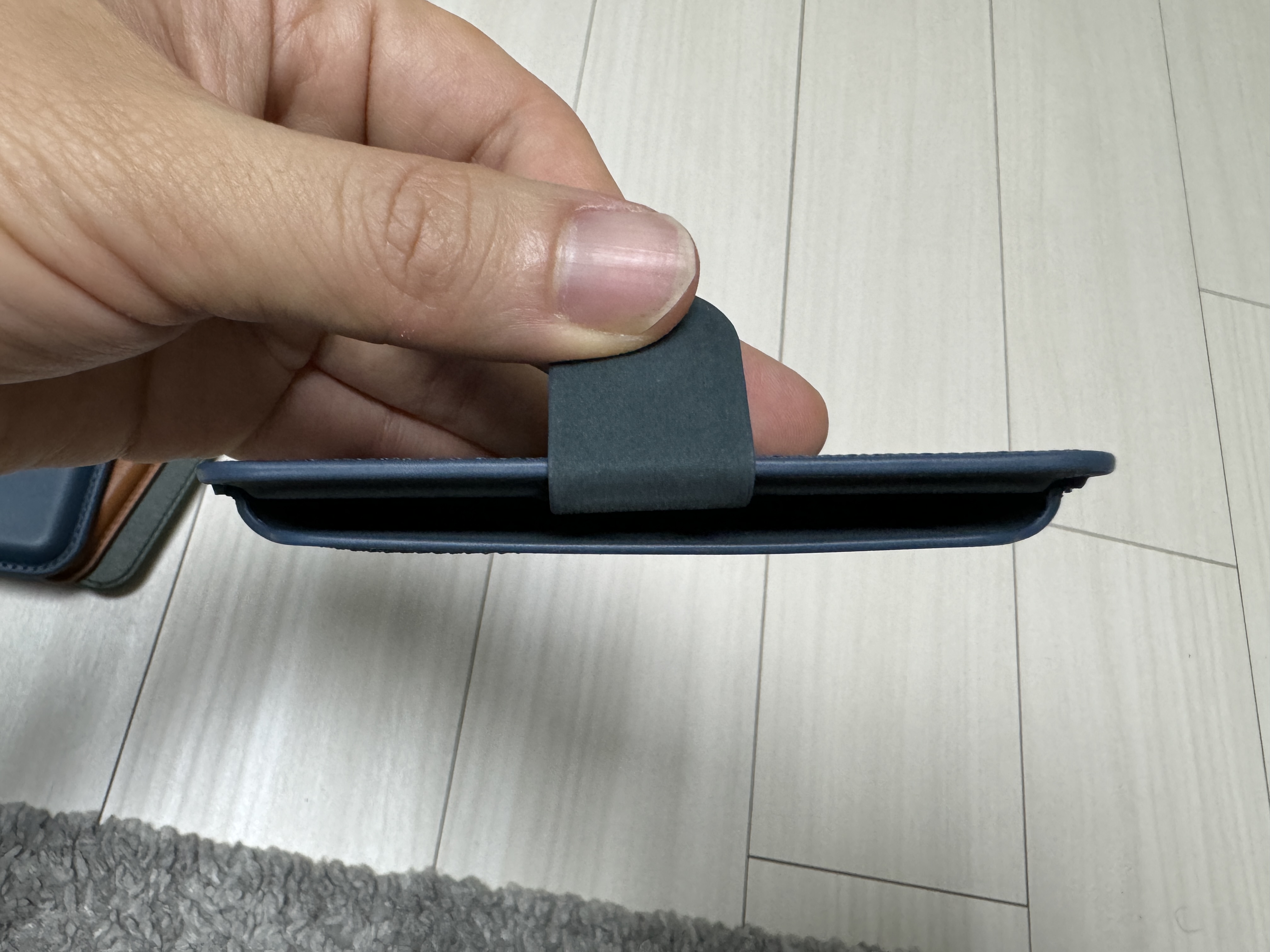 강력한 자력 덕분에 아래와 같이 지갑에 붙어 있는 밴드에 손가락을 걸어 아이폰을 안정적으로 파지 할 수 있다. 신지모루의 지갑은 그립톡의 역할도 어느 정도는 할 수 있다.