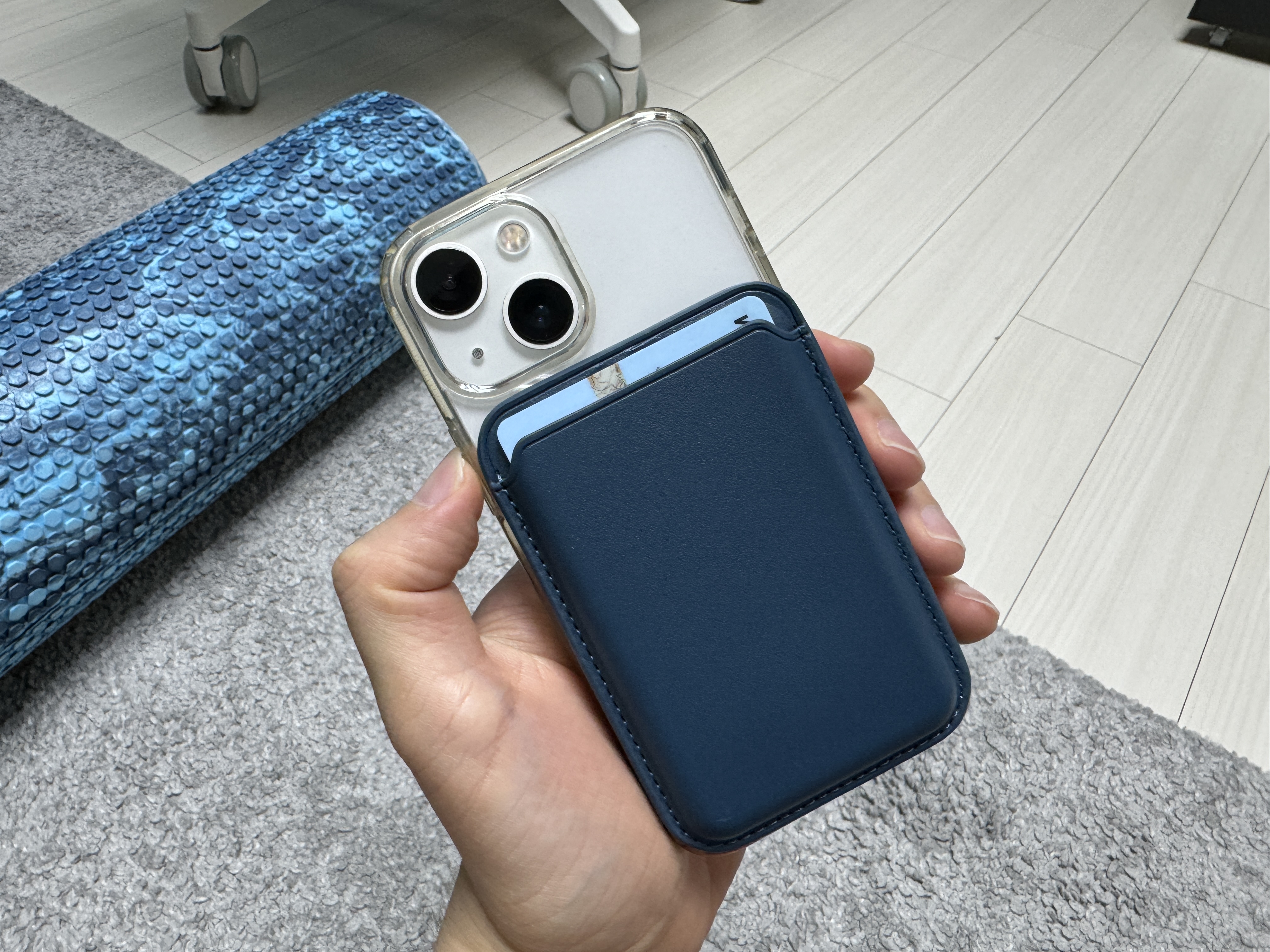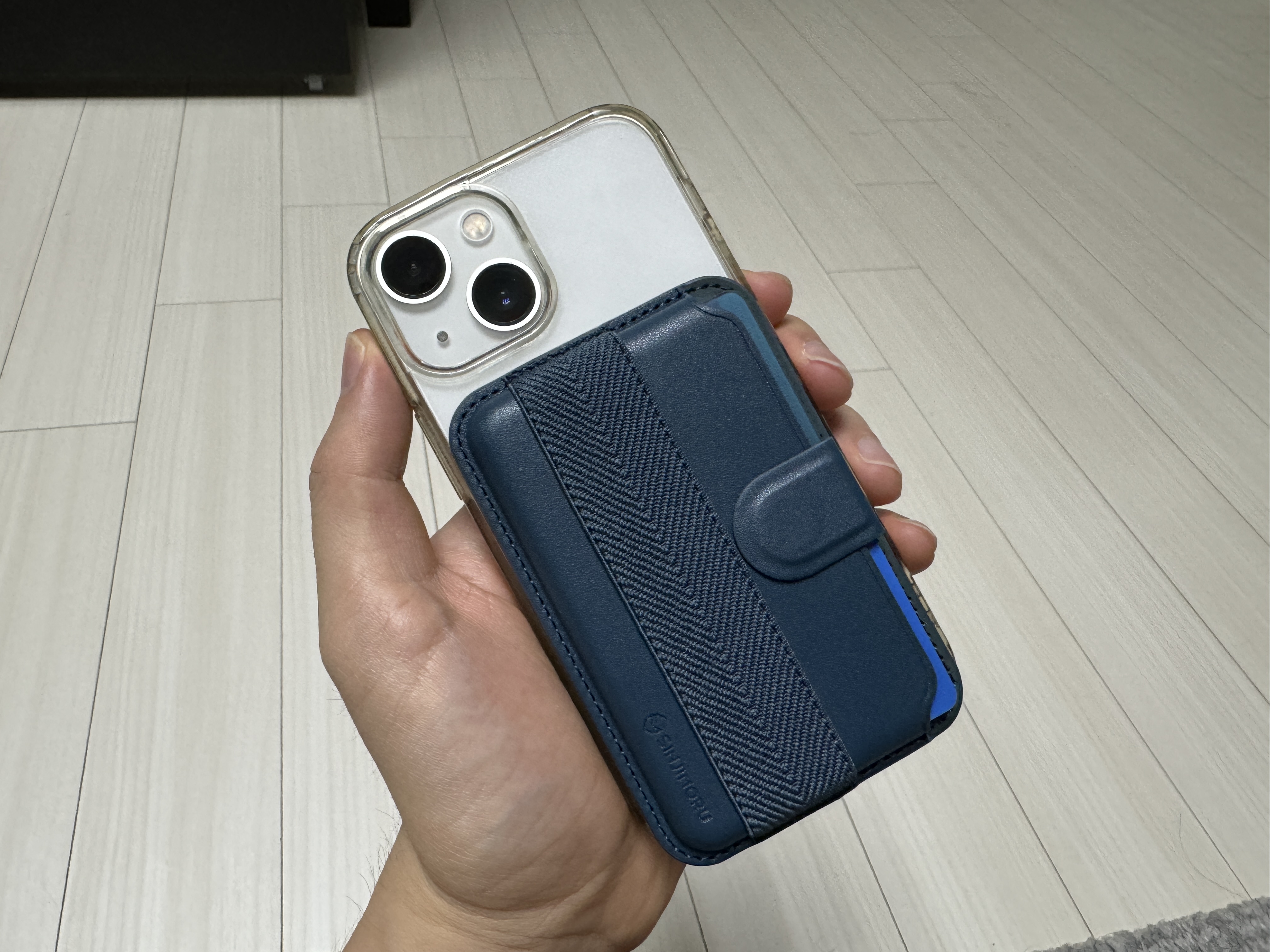 마지막으로 살펴볼 항목은 아이폰에 얼마나 강하게 붙어 있는지에 대한 것이다. 지갑 자력 테스트에 사용된 아이폰은 와이프가 사용하는 아이폰 13 미니임을 알린다. 가장 먼저 다이소 지갑 먼저 살펴보자.