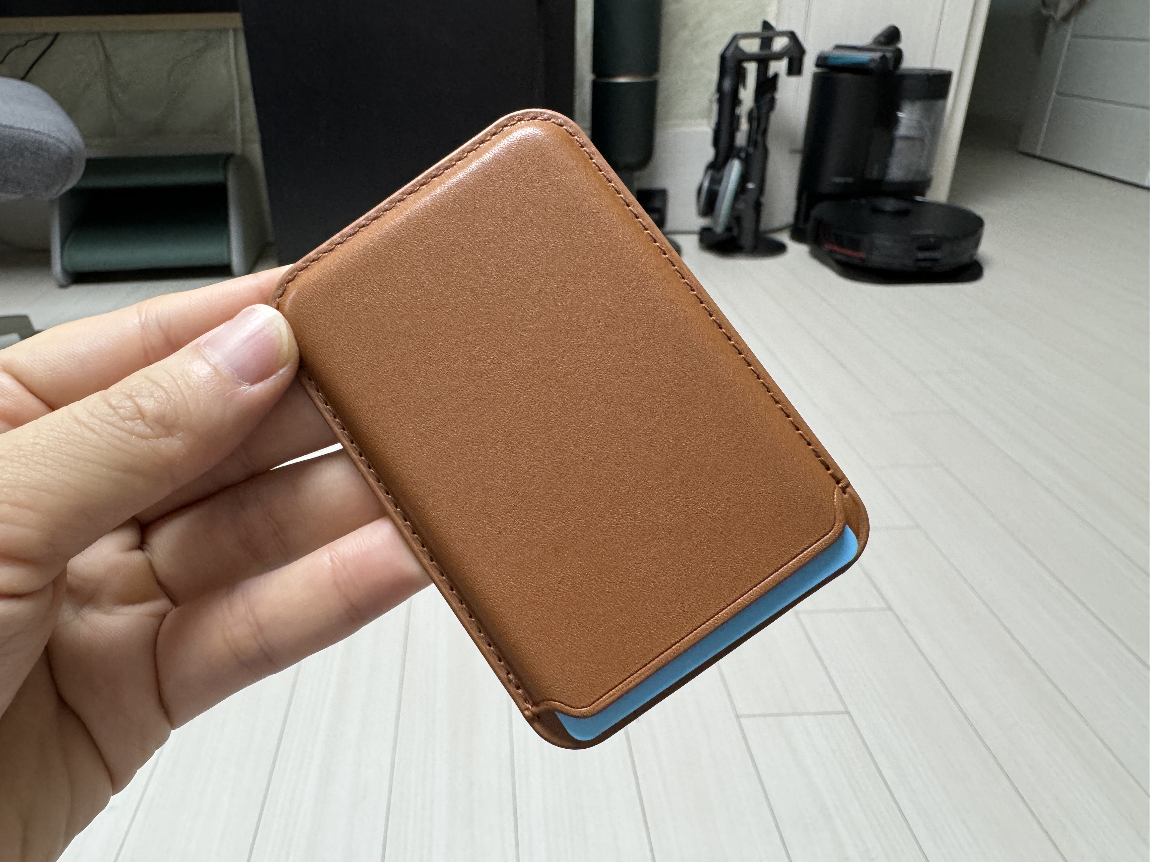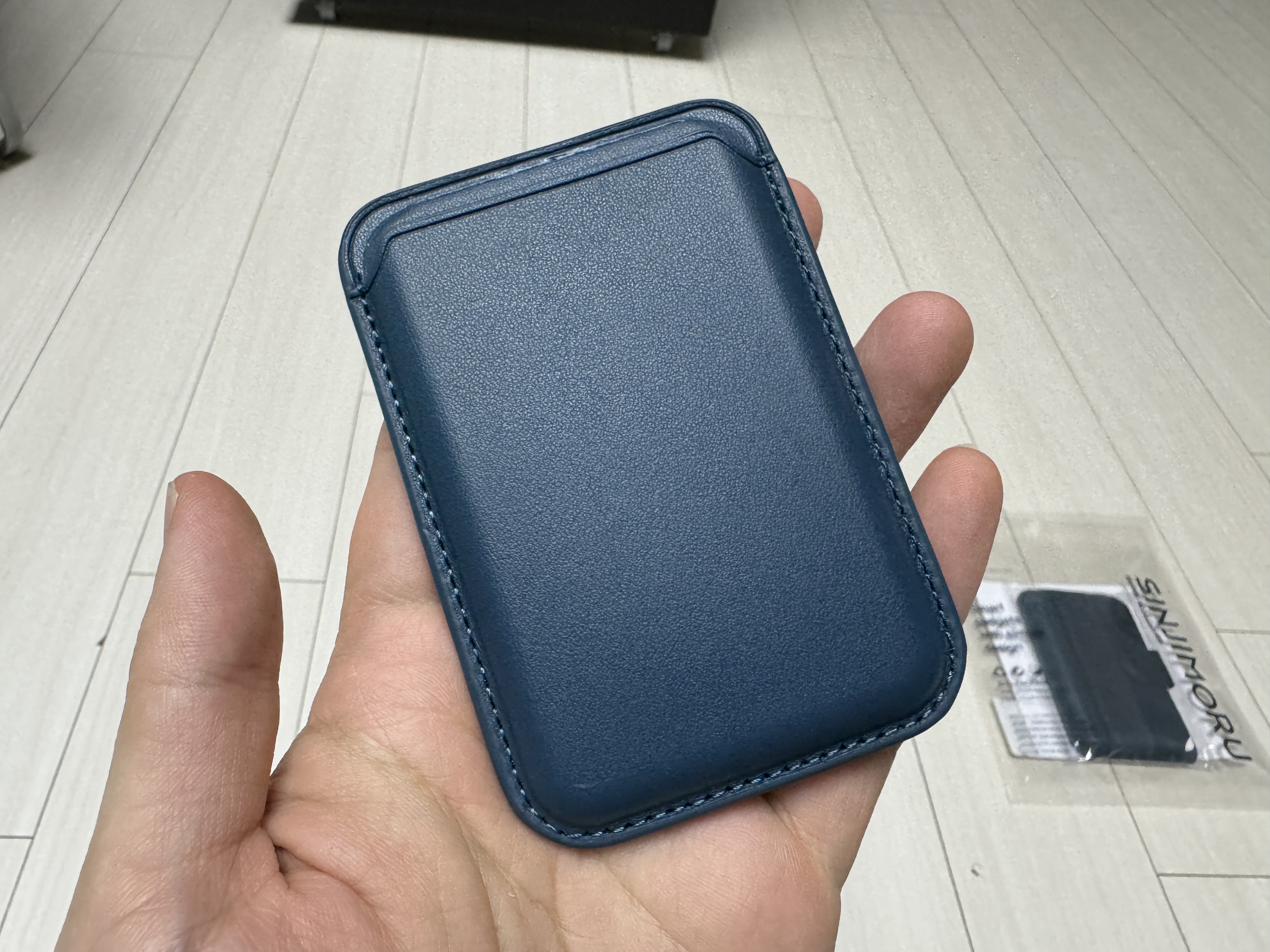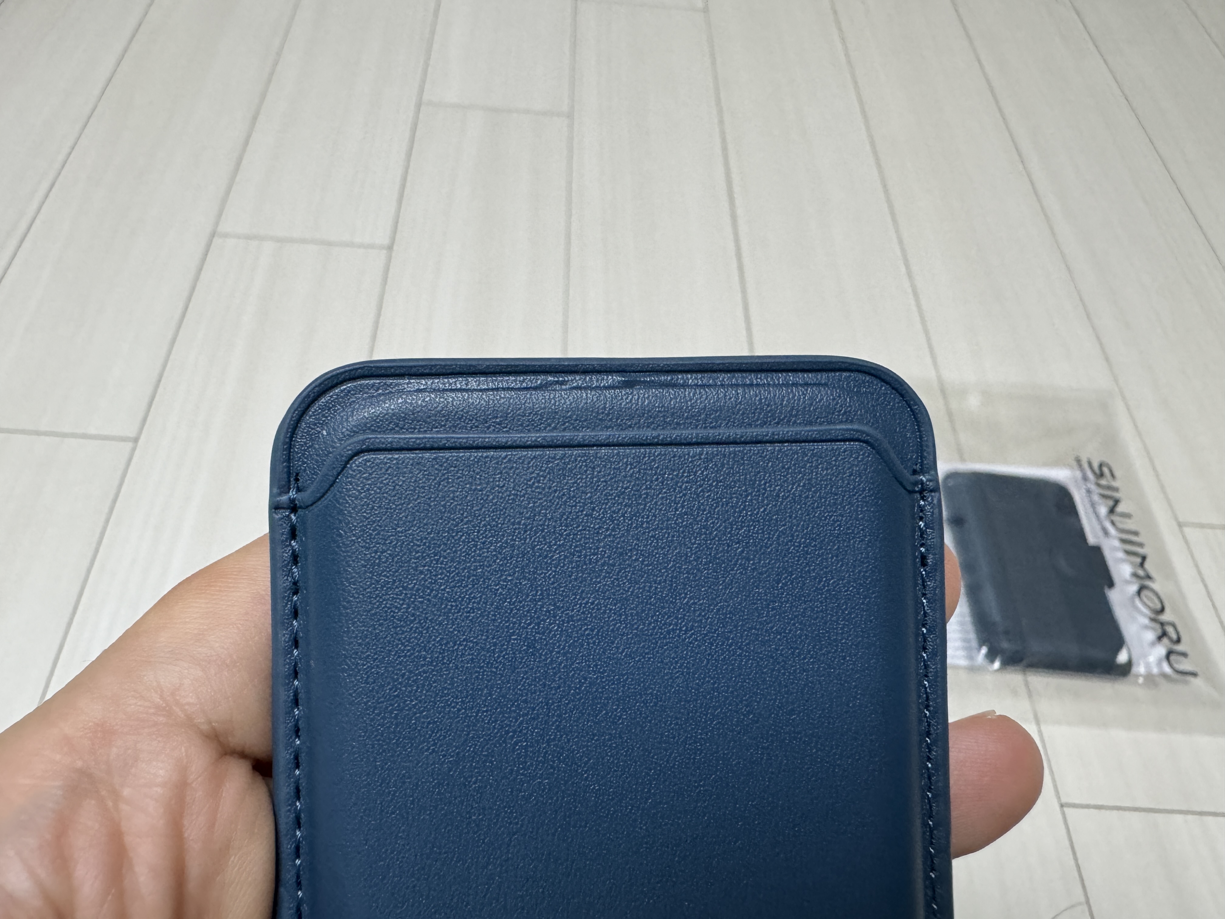 가죽의 느낌은 바우아토 지갑보다는 다이소 지갑에 가까운 느낌이 들고, 가죽이 얇아서 그런지 다이소 지갑과 무게 차이가 크게 차이 나지 않았다. 박음질도 균일하게 잘되어 있고 색상도 고급스러운 인디고 블루 컬러로 되어 있다. 특이한 점은 지갑 후면부에 맥세이프 모양의 그래픽이 연하게 프린팅 되어 있다는 것이다.
