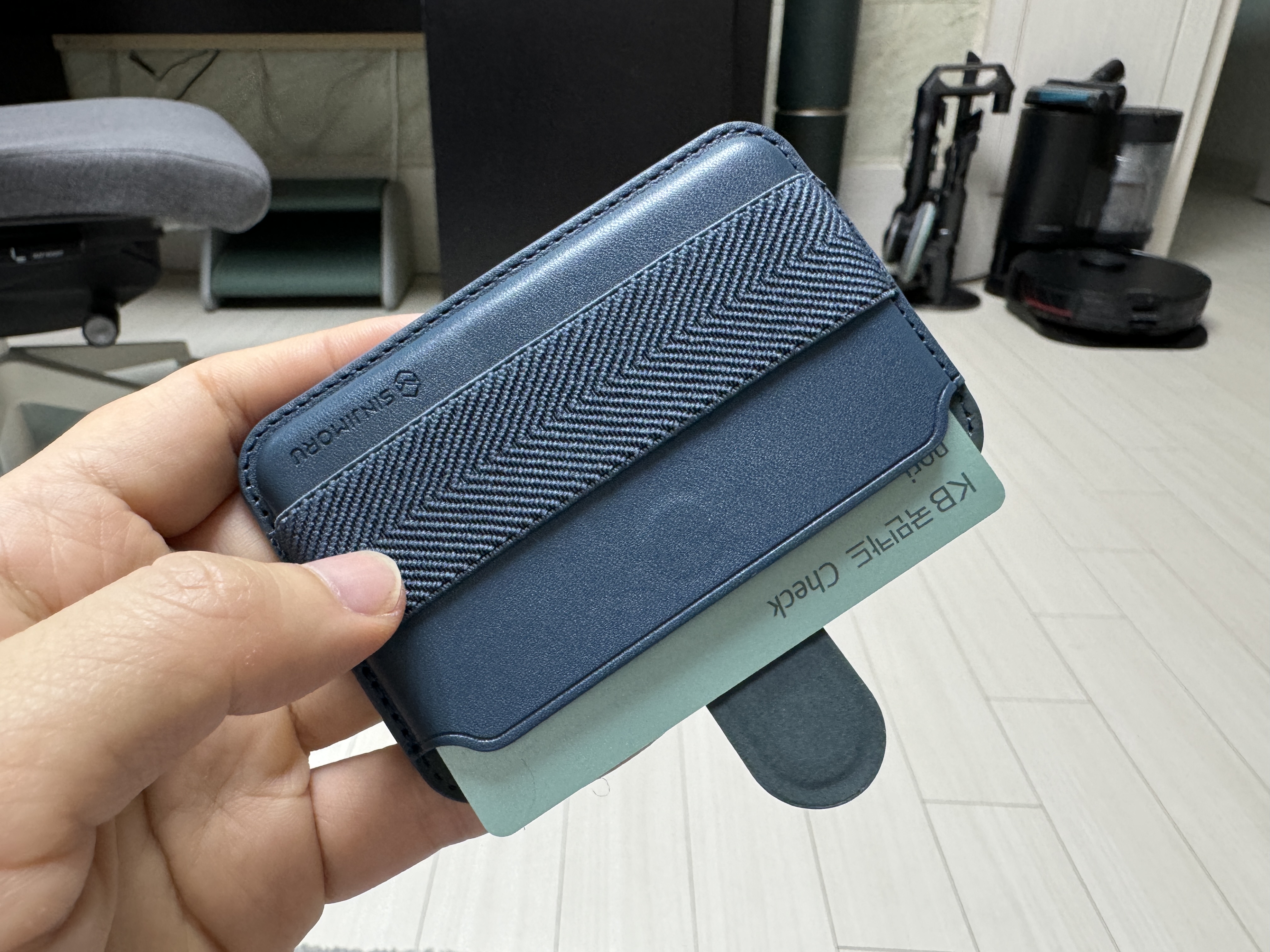 마지막으로 신지모루 지갑이다. 굉장히 강력한 자력을 가지고 있다. 옆으로 밀어야 간신히 떨어지는 수준이다. 지갑이 스스로 떨어질 일은 발생하지 않을 것 같다.