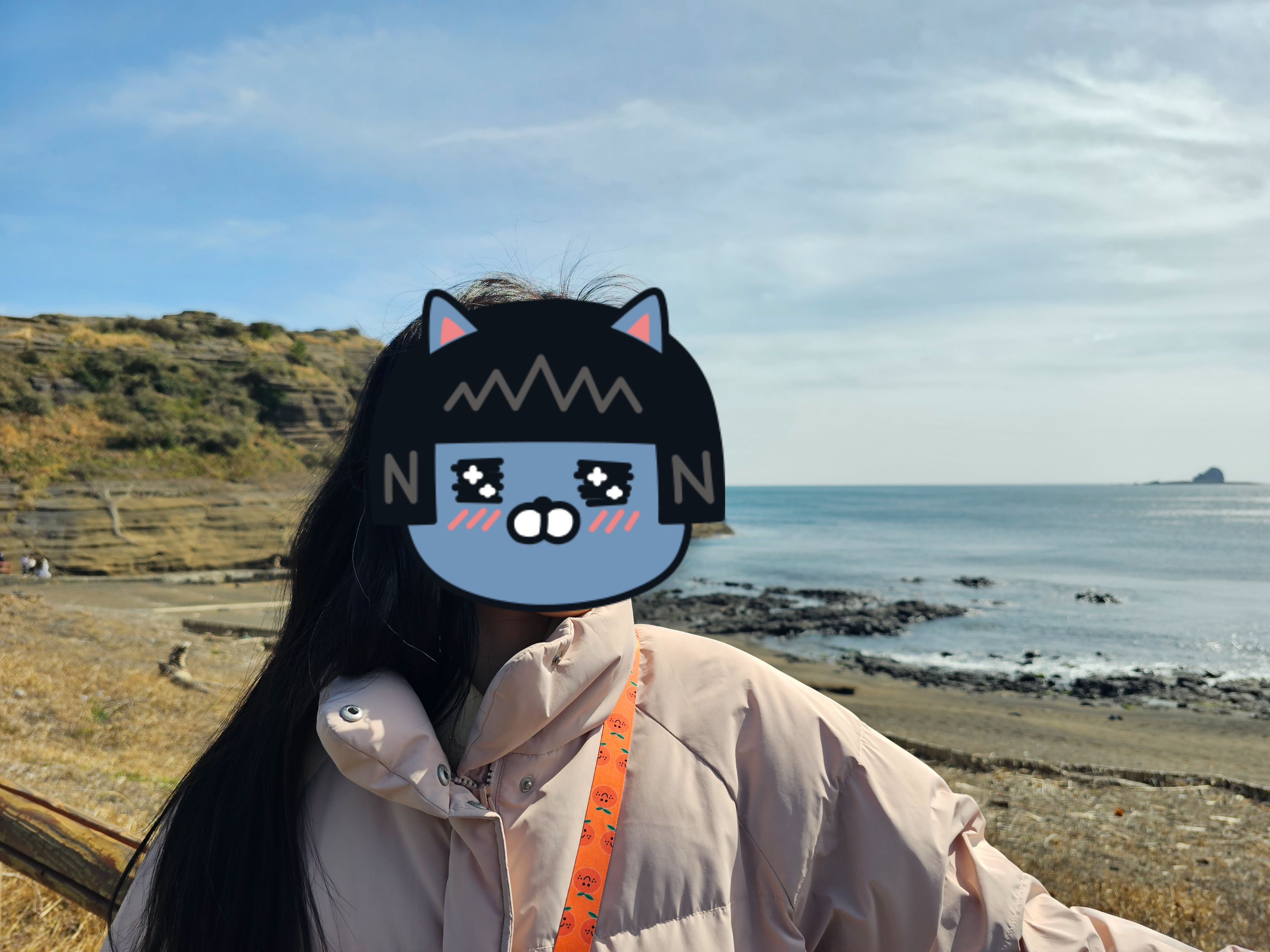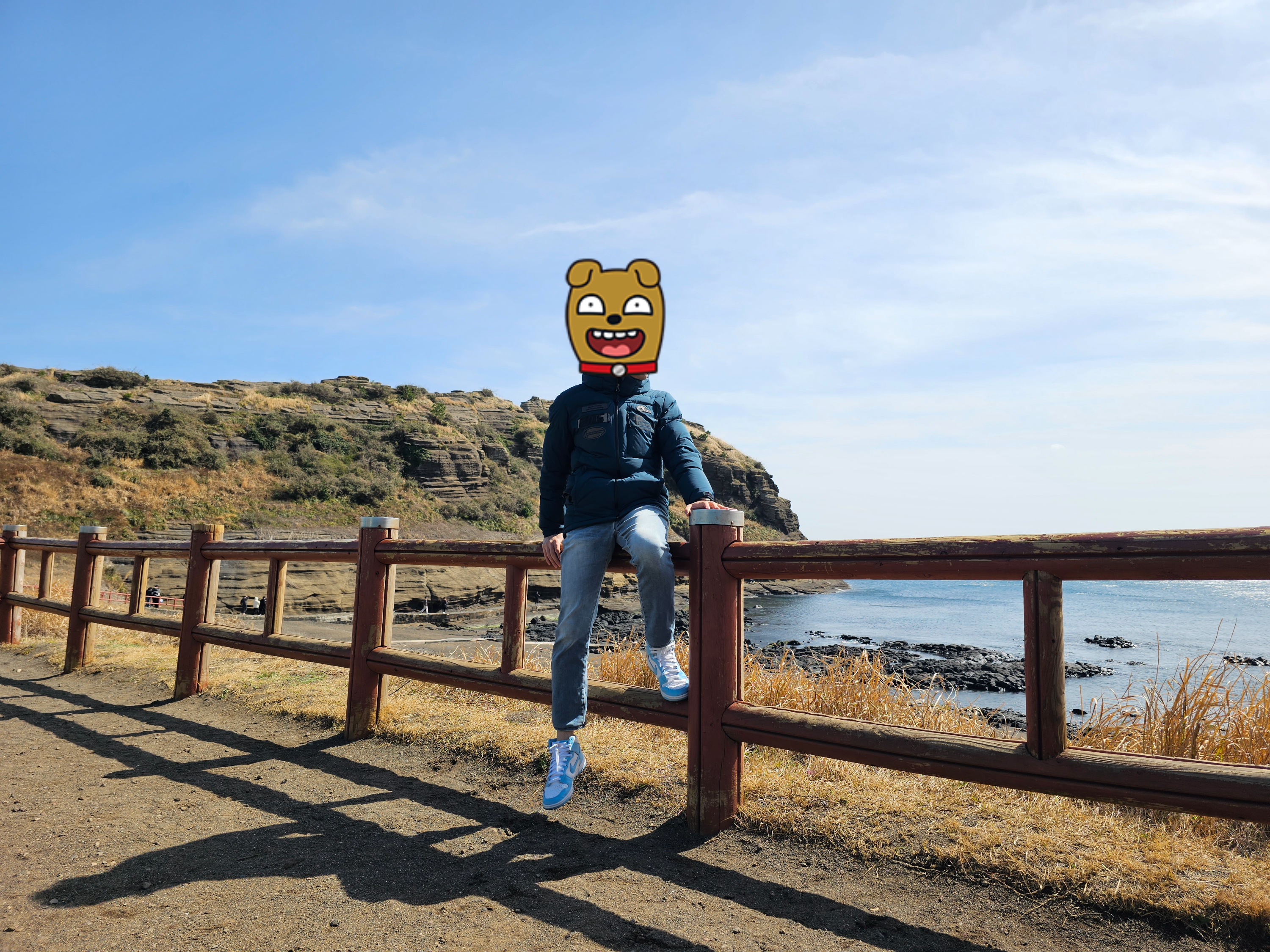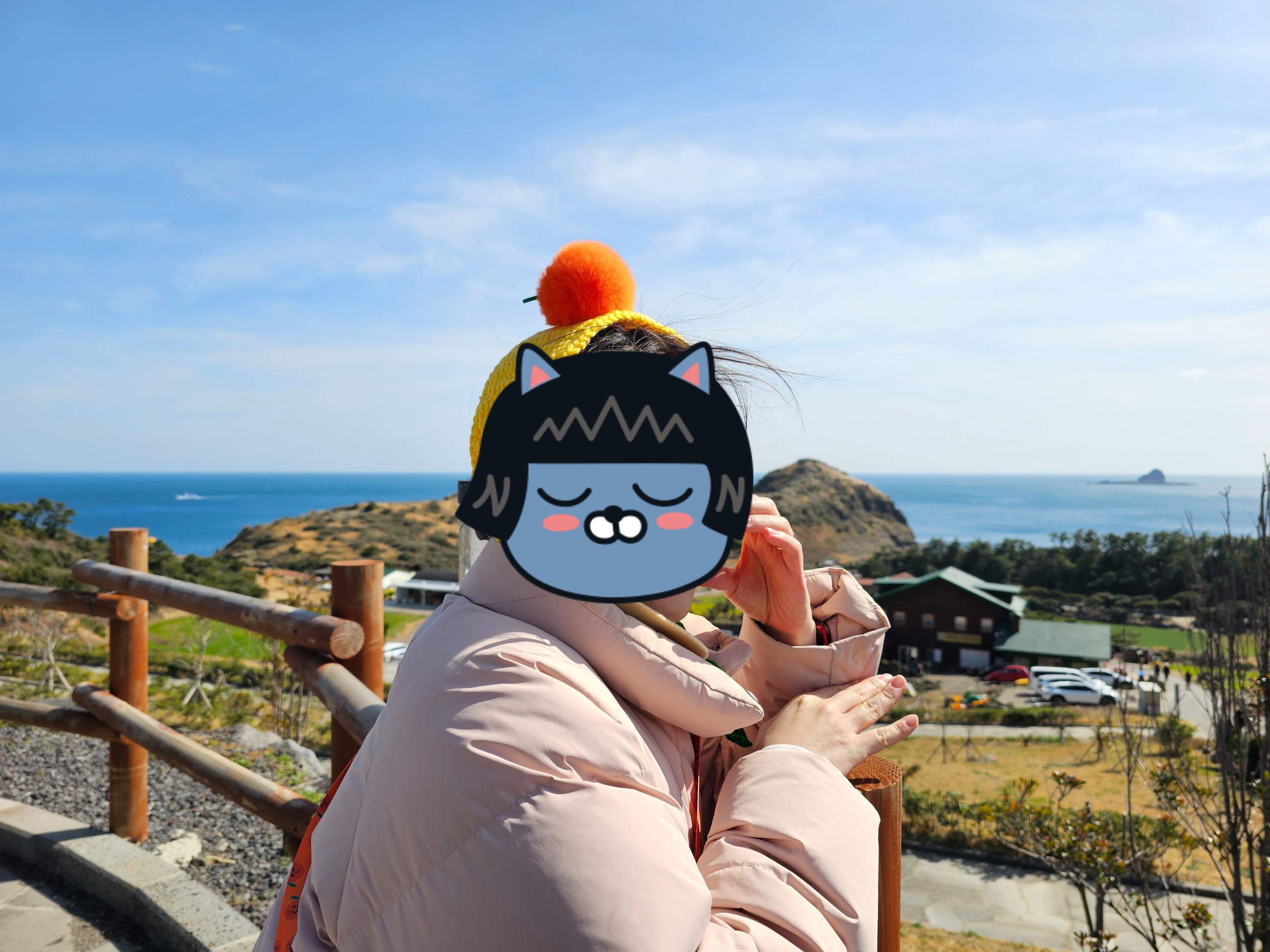 카페에서 커피를 마신 후 밖으로 나왔다. 카페 앞에 있는 포토존에서 제주도 남쪽 바다의 풍경과 함께 여러 장의 사진을 찍었다.