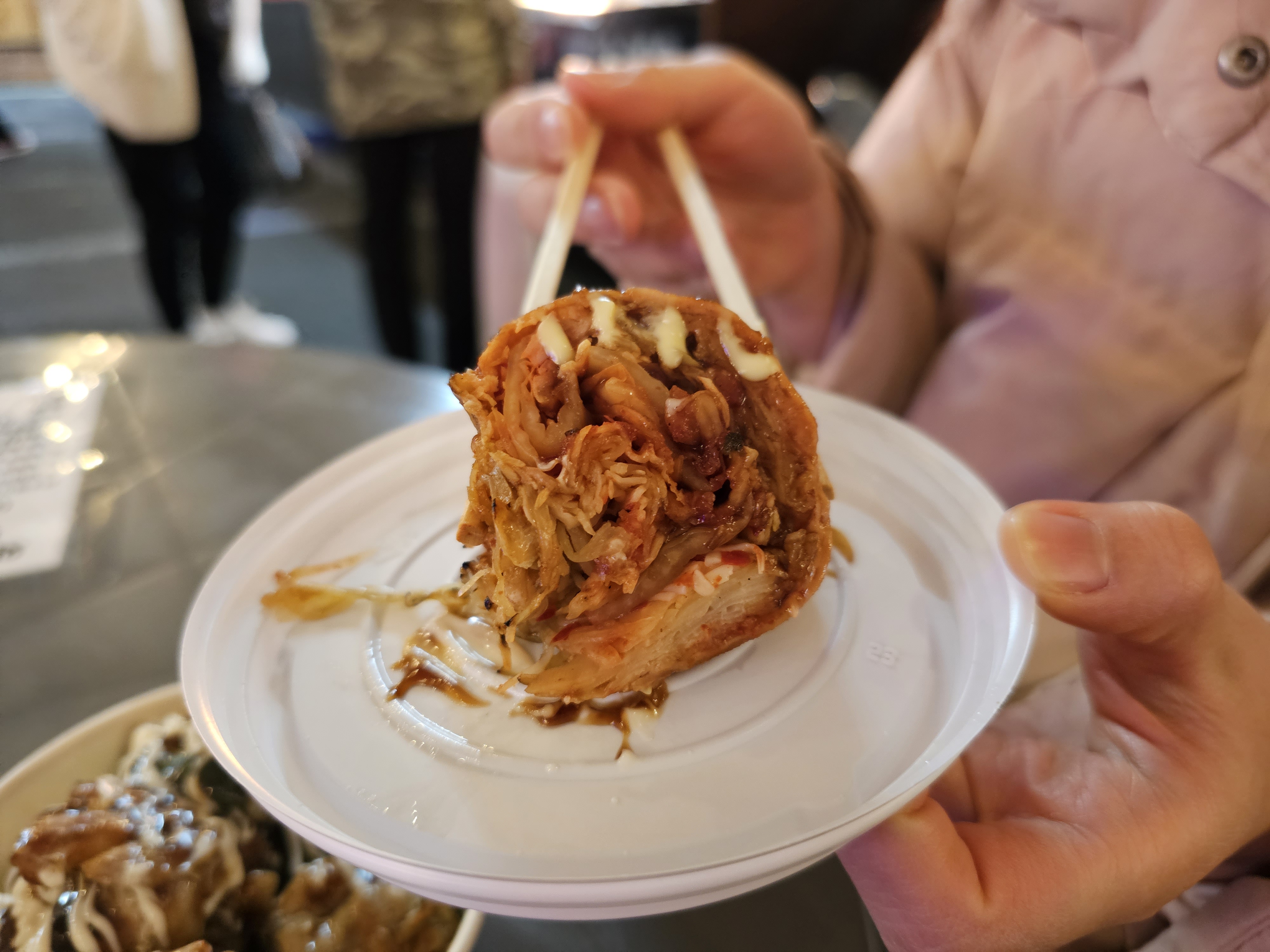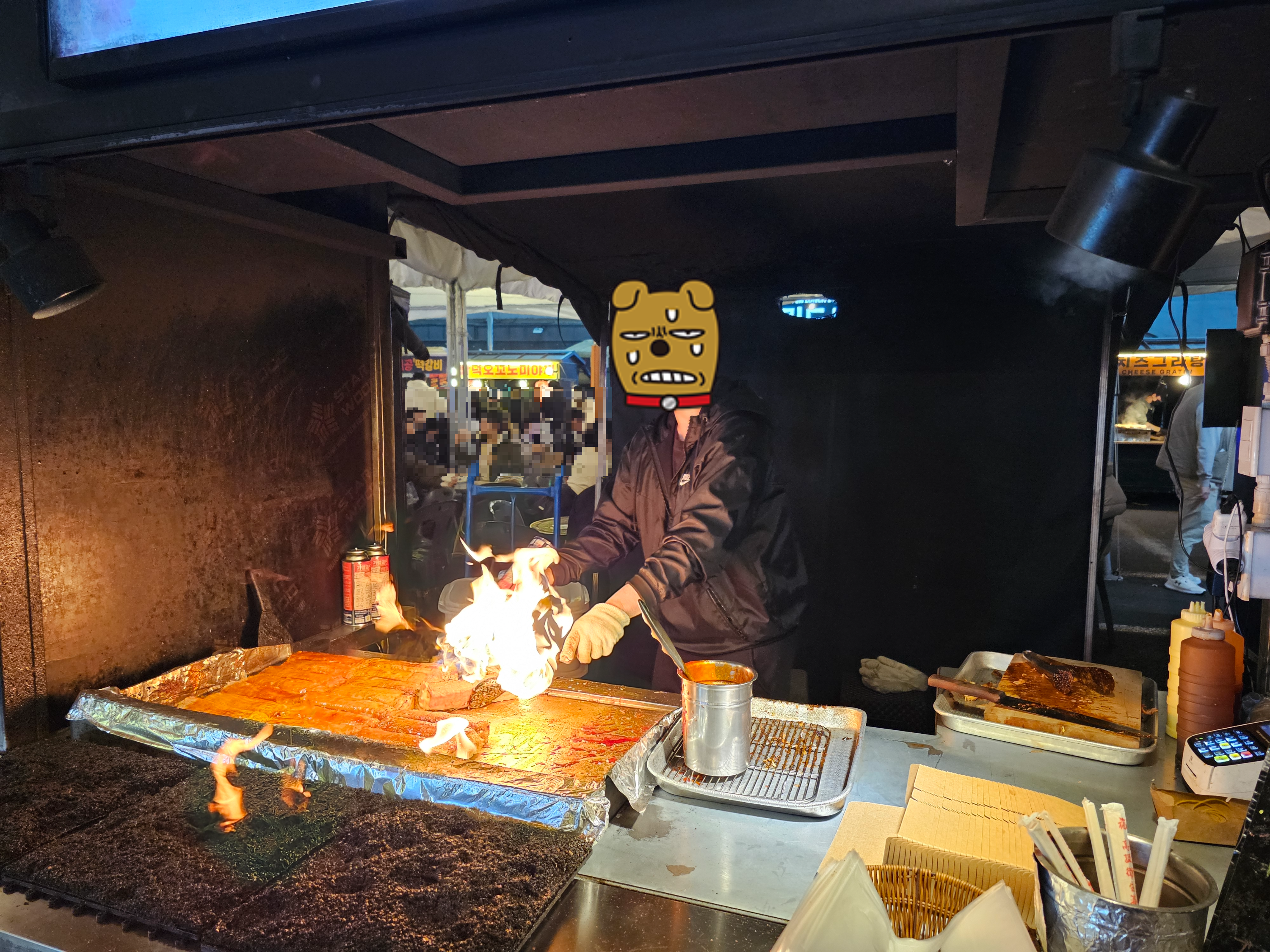 부모님들과 지인에게 드릴 선물을 택배로 예약한 후, 올레 시장 가운데에 있는 청년 광장이라는 곳에서 삼겹살 랩과 닭꼬치를 주문하였다. 음식을 조리하면서 보이는 화려한 퍼포먼스가 이곳의 볼거리 중 하나.