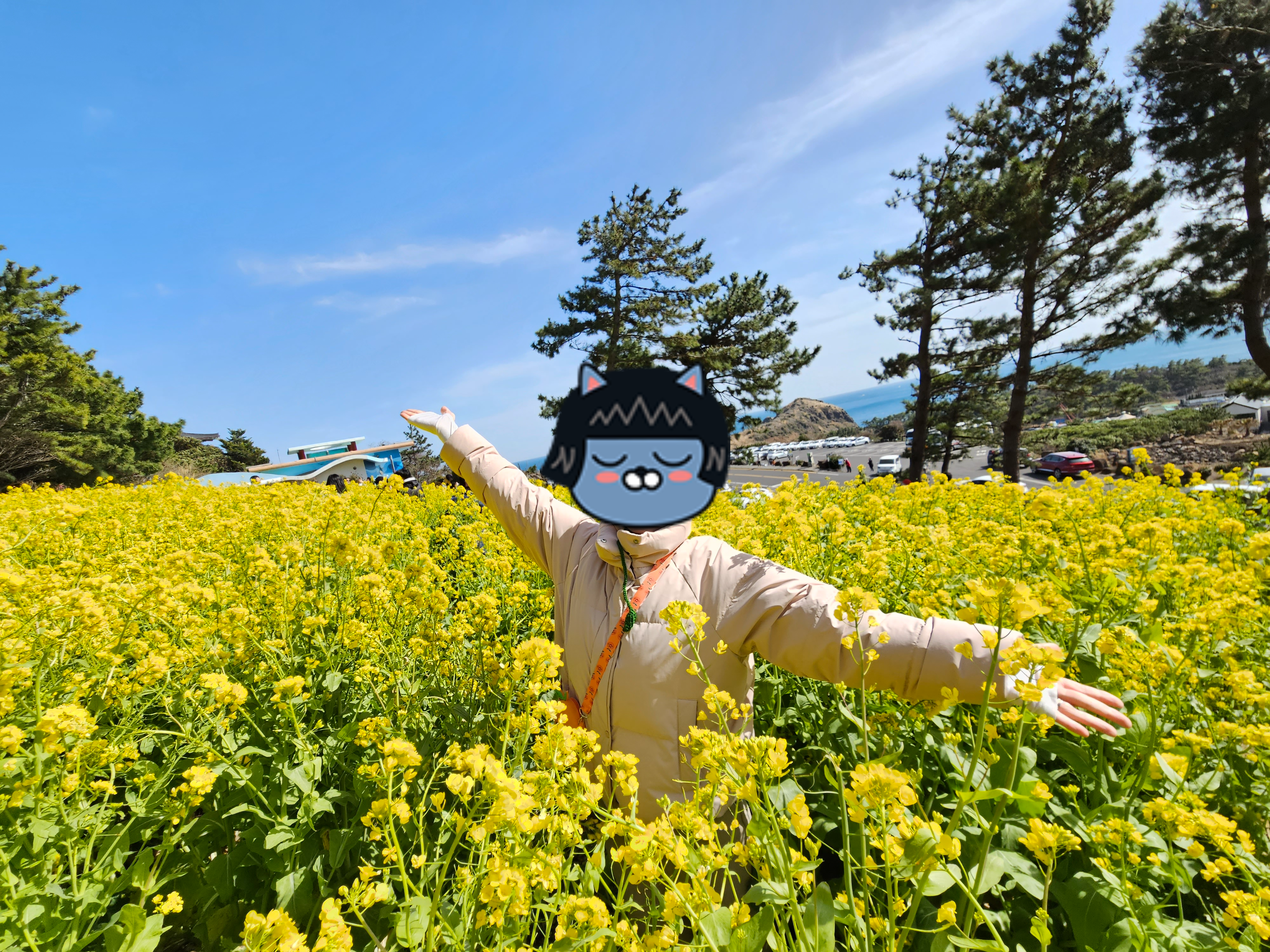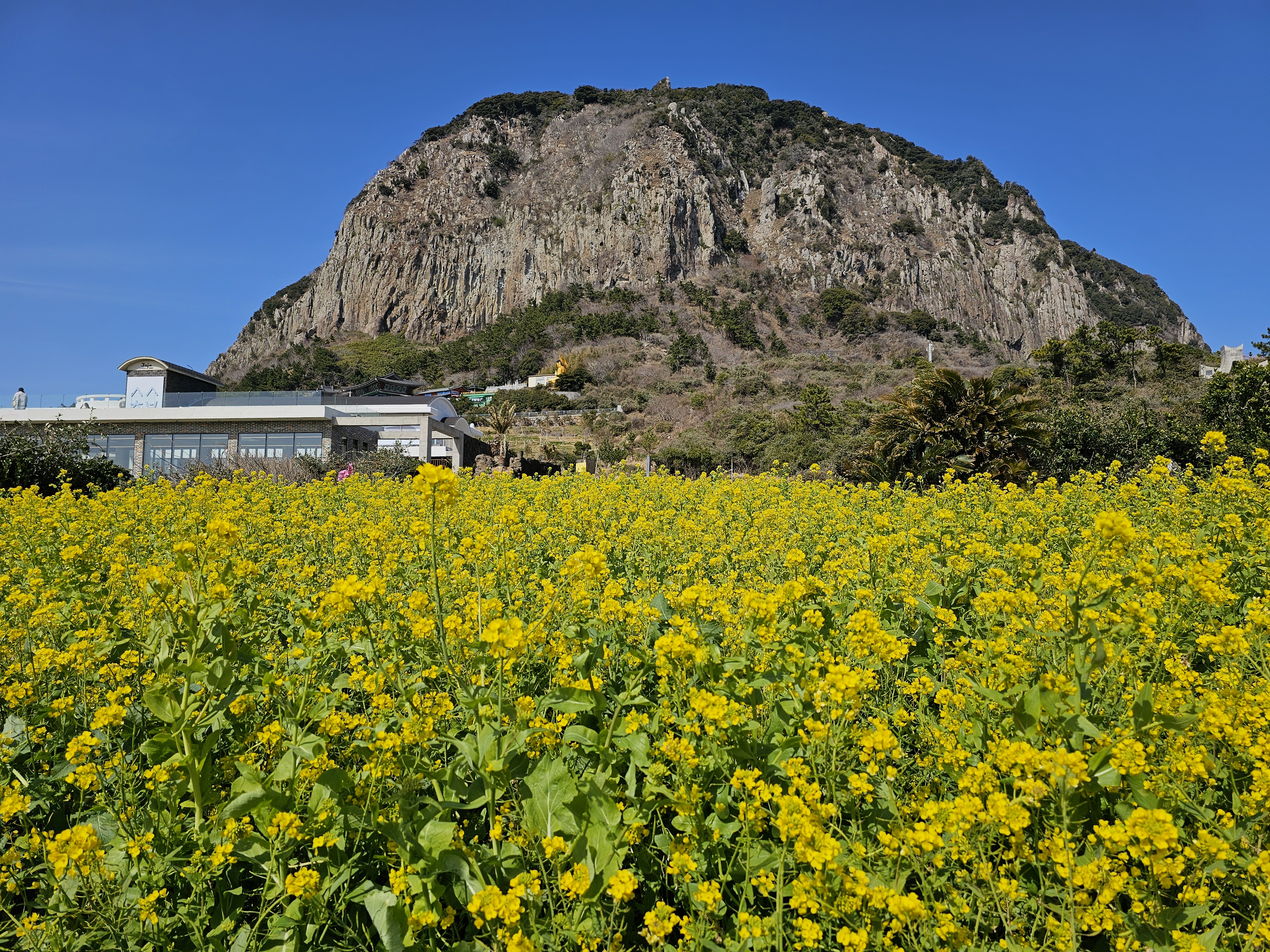 아점을 배부르게 먹고 곧바로 산방산으로 이동하였다. 산방산 공영 주차장에 주차를 하고 보니 거대한 바위산과 중앙에 노랗게 활짝 핀 유채꽃 군락지가 보였다.