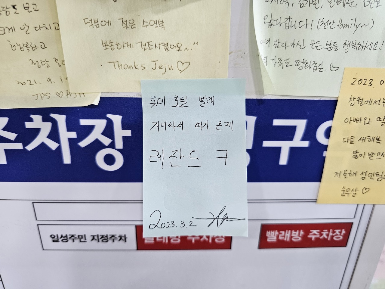 호텔에 짐을 푼 뒤 나는 밀린 빨래를 하러 제주 시내의 코인 빨래방으로 향했고, 와이프는 롯데 호텔의 수영장에서 수영을 하며 개인 정비를 하기로 했다. 빨래방에 방명록 같이 포스트-잇으로 붙여 놓은 게 많아서 흔적도 남길 겸 나도 하나 붙여놨다. (호텔 세탁비를 지불할 만큼 빨래가 많지 않아서 코인 세탁방에 들렸다.)