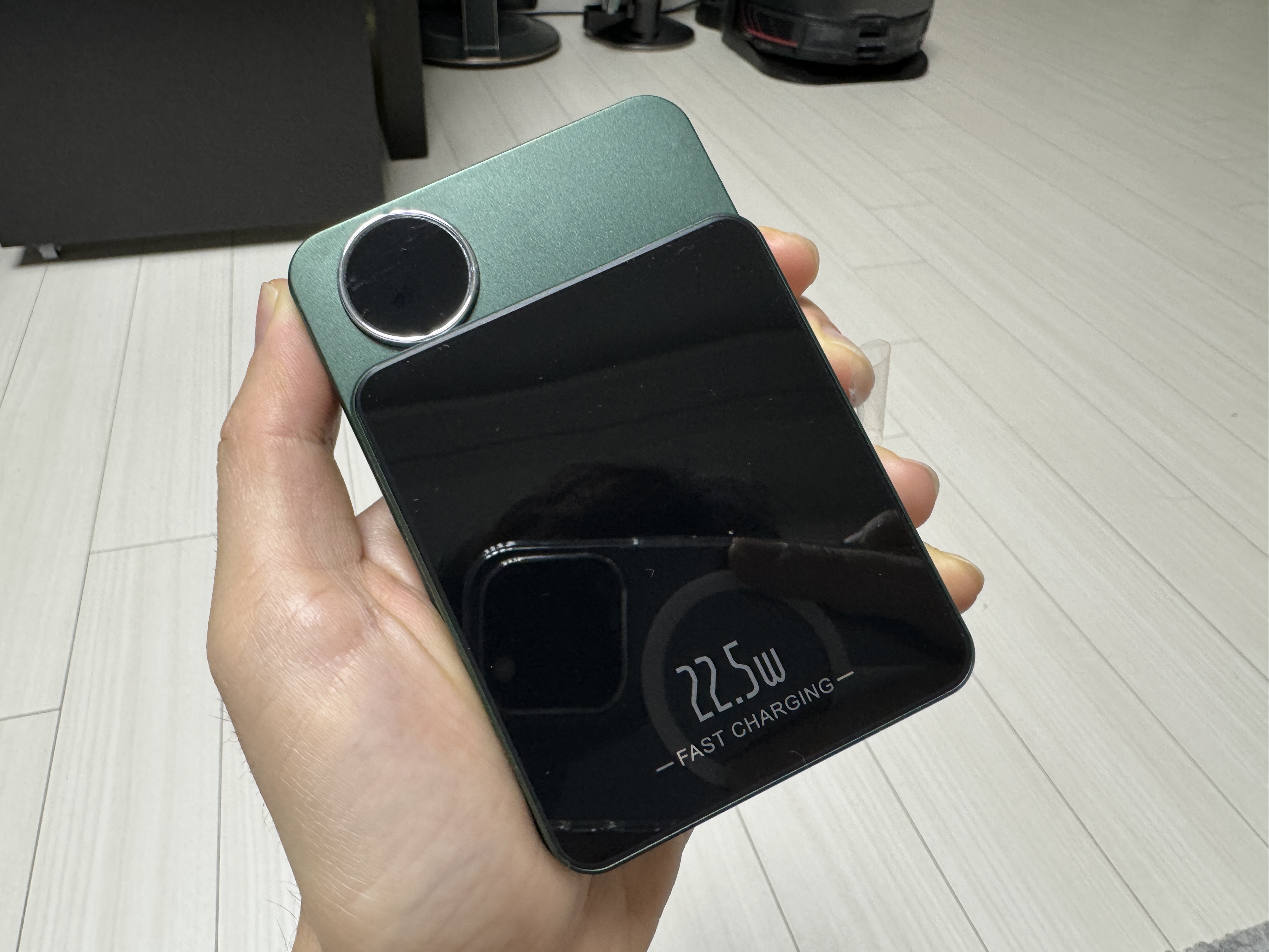 다른 구성품들은 굳이 살펴볼 필요는 없고 맥세이프 배터리 본체만 살펴보자. 디자인 자체는 개인적으로는 생각보다 나쁘지 않았다. 플라스틱 바디에 펄이 들어간 어두운 녹색으로 도색되어 있는데, 멀리서 보면 마치 알루미늄 재질인 것처럼 느껴진다.