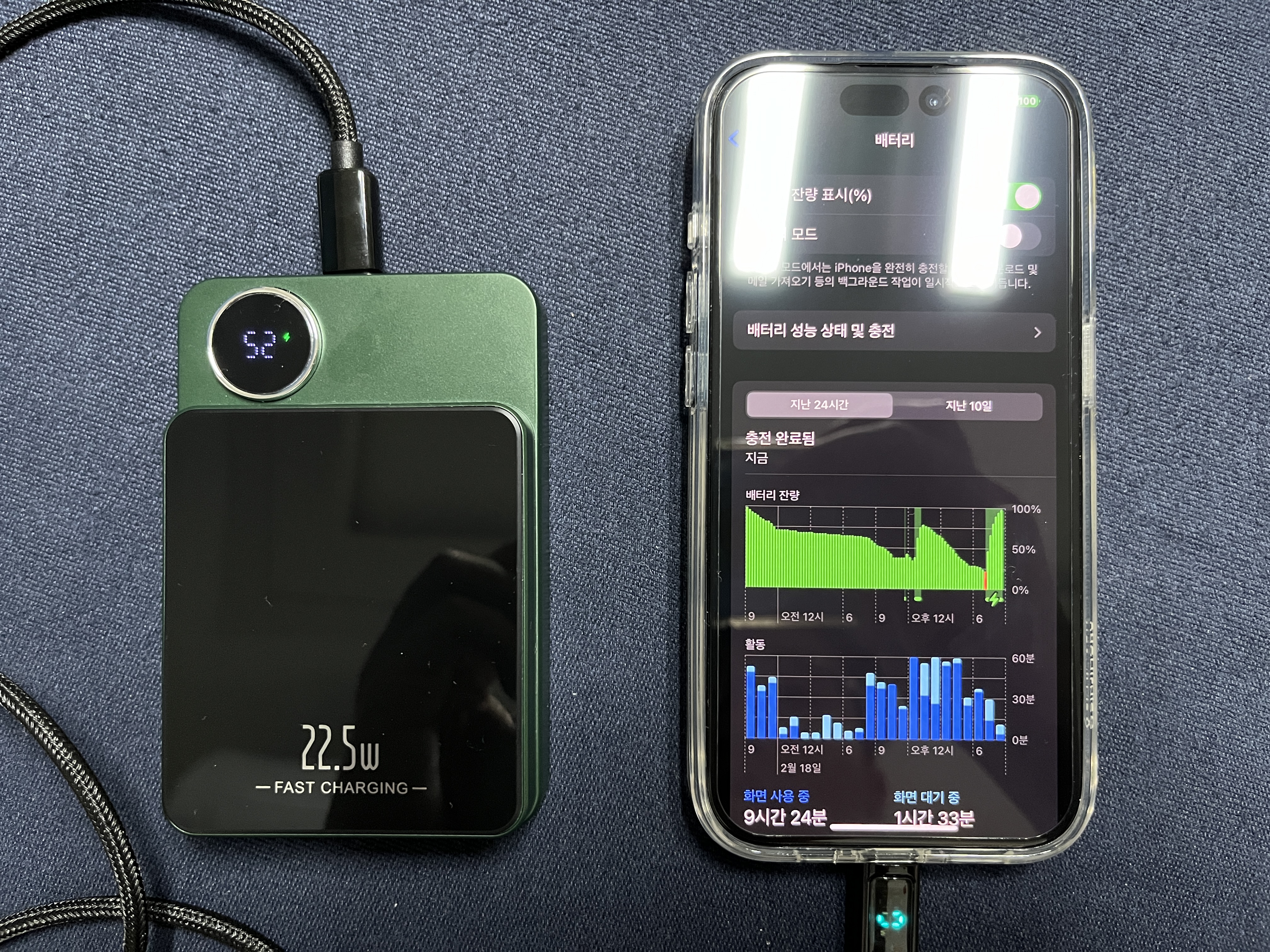 만약, "충전 최적화" 기능을 해제하였다면 1시간 20분 내로 0 ~ 100%까지 충전이 가능할 것으로 예상한다. 충전하는 동안 보조 배터리의 출력이 저하되지 않고 일정하게 20W 출력을 내주었기 때문이다. 쿠팡이 추천하는 맥세이프 보조 배터리는 유선 충전 환경에서는 큰 무리 없이 고속 충전이 가능하다는 것을 테스트로 확인할 수 있었다.