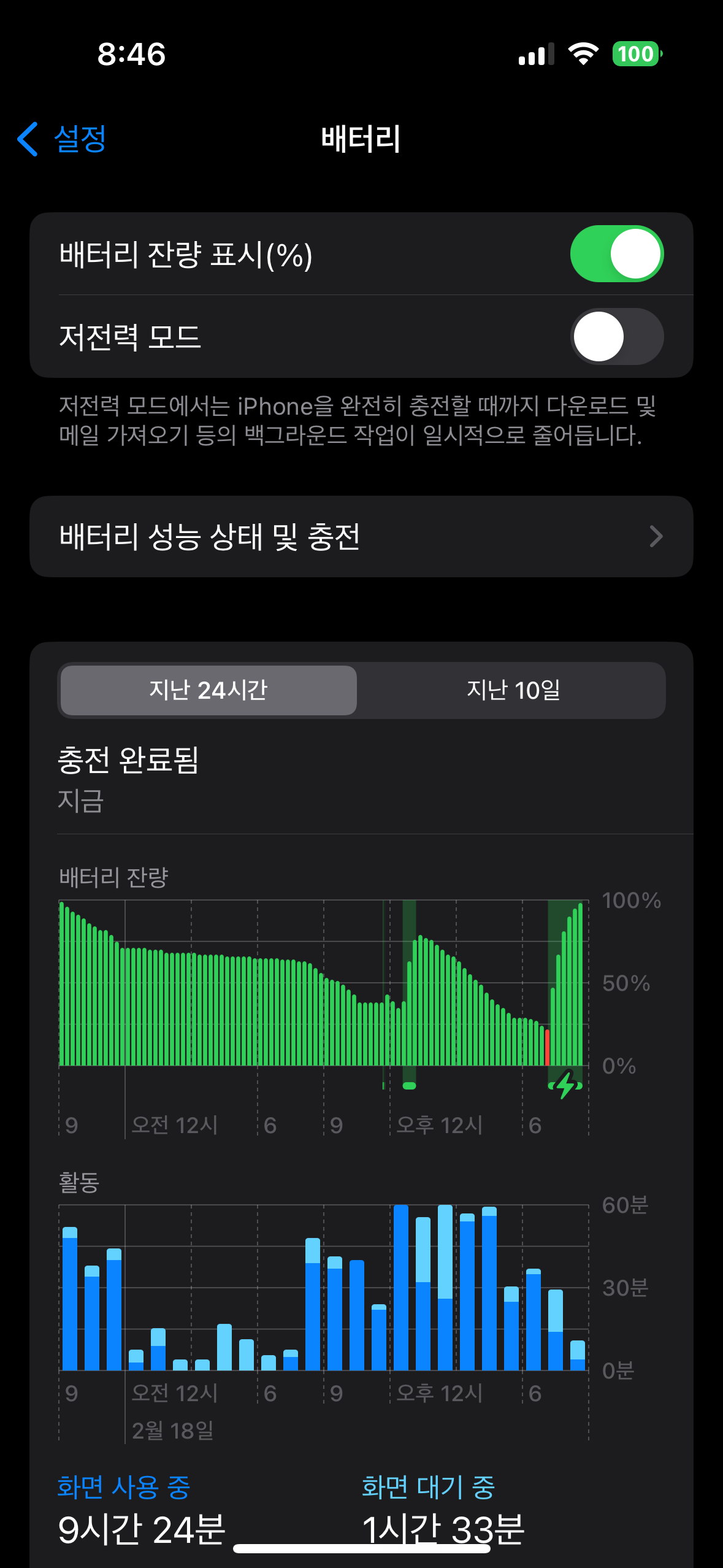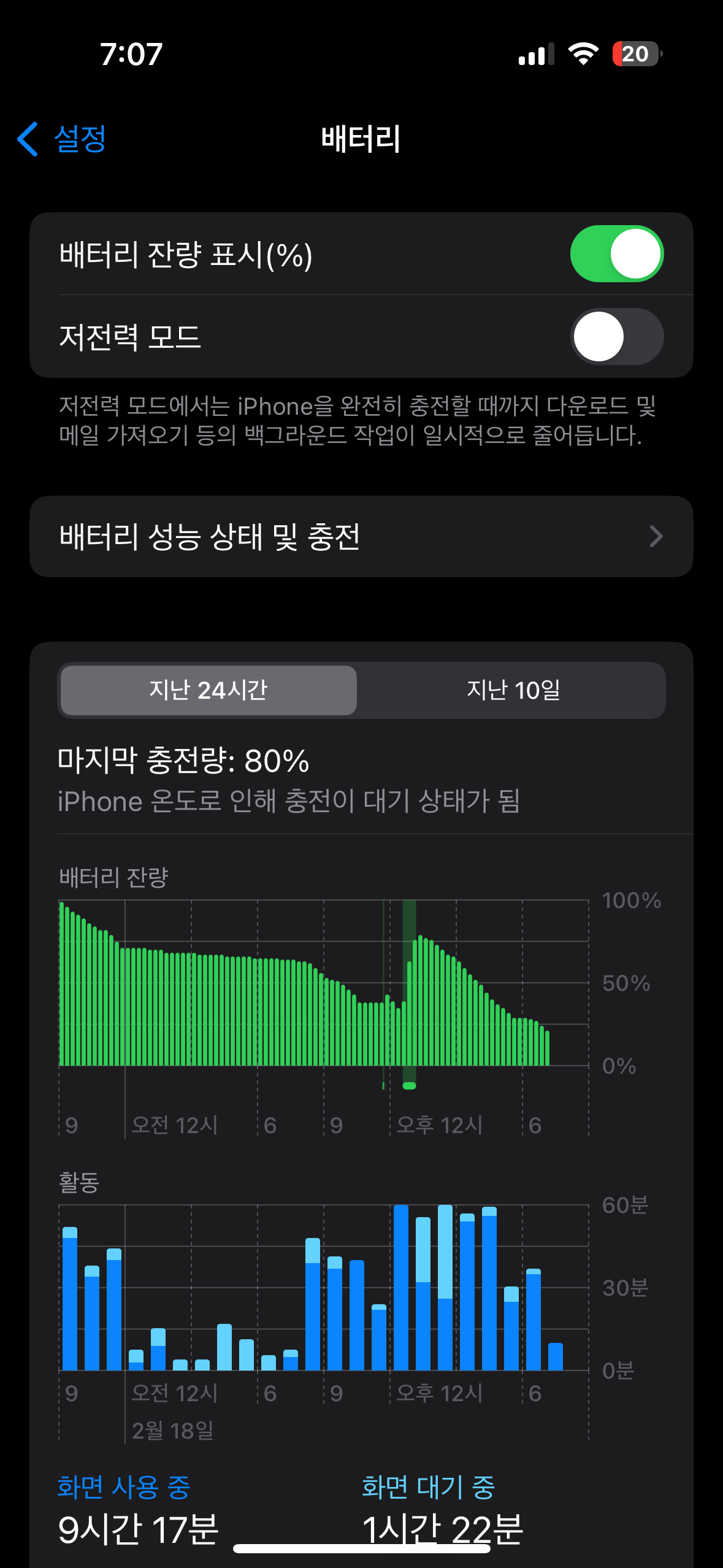| 예상외로 (?) 안정적인 고출력을 보여주는 20W 유선 충전 | |