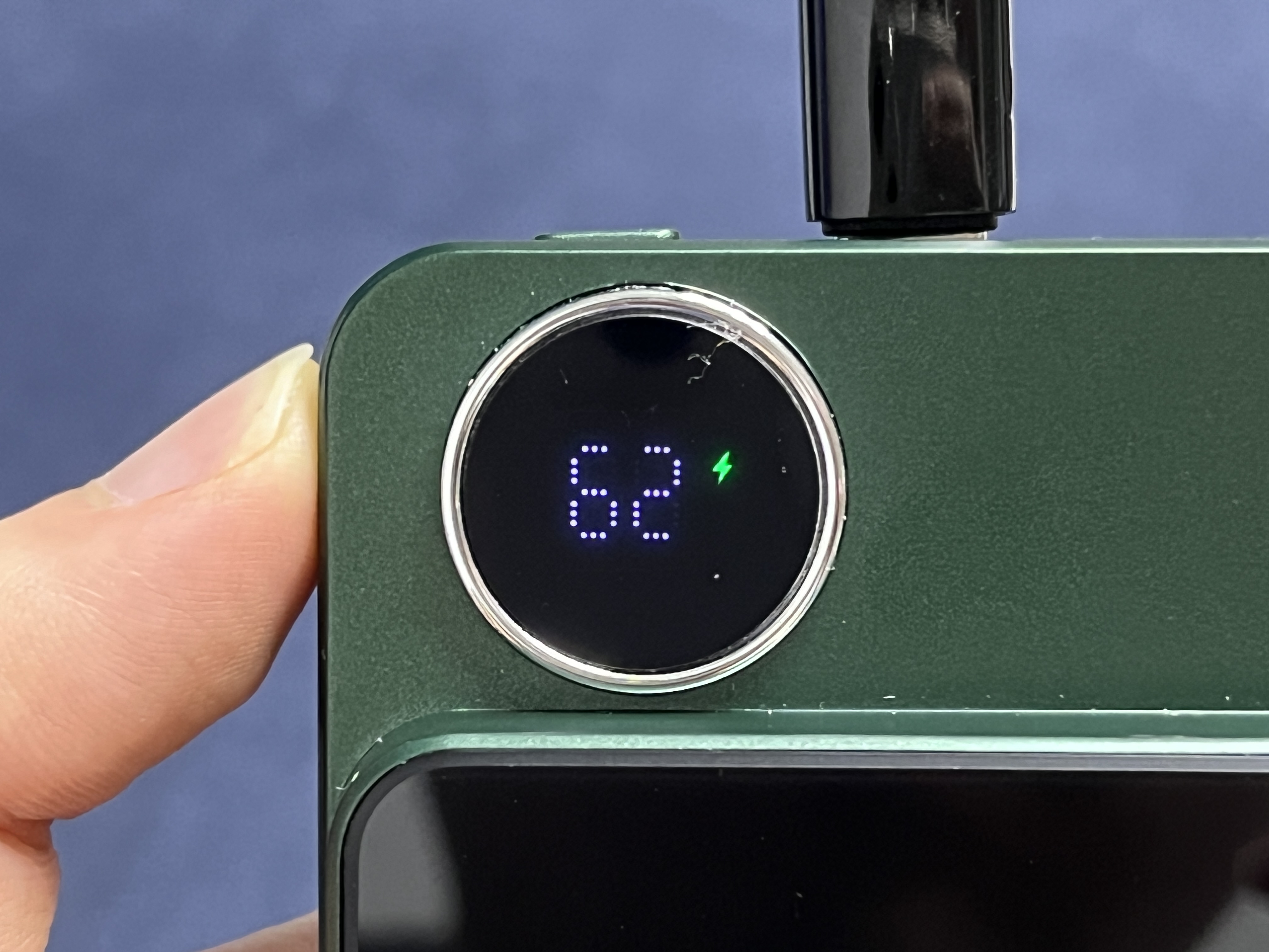전면부에는 배터리의 충전 상태를 나타내는 디스플레이가 있다. 무선 충전을 하는 경우에는 오른쪽 사진과 같이 안테나 같은 표시가 점등된다.