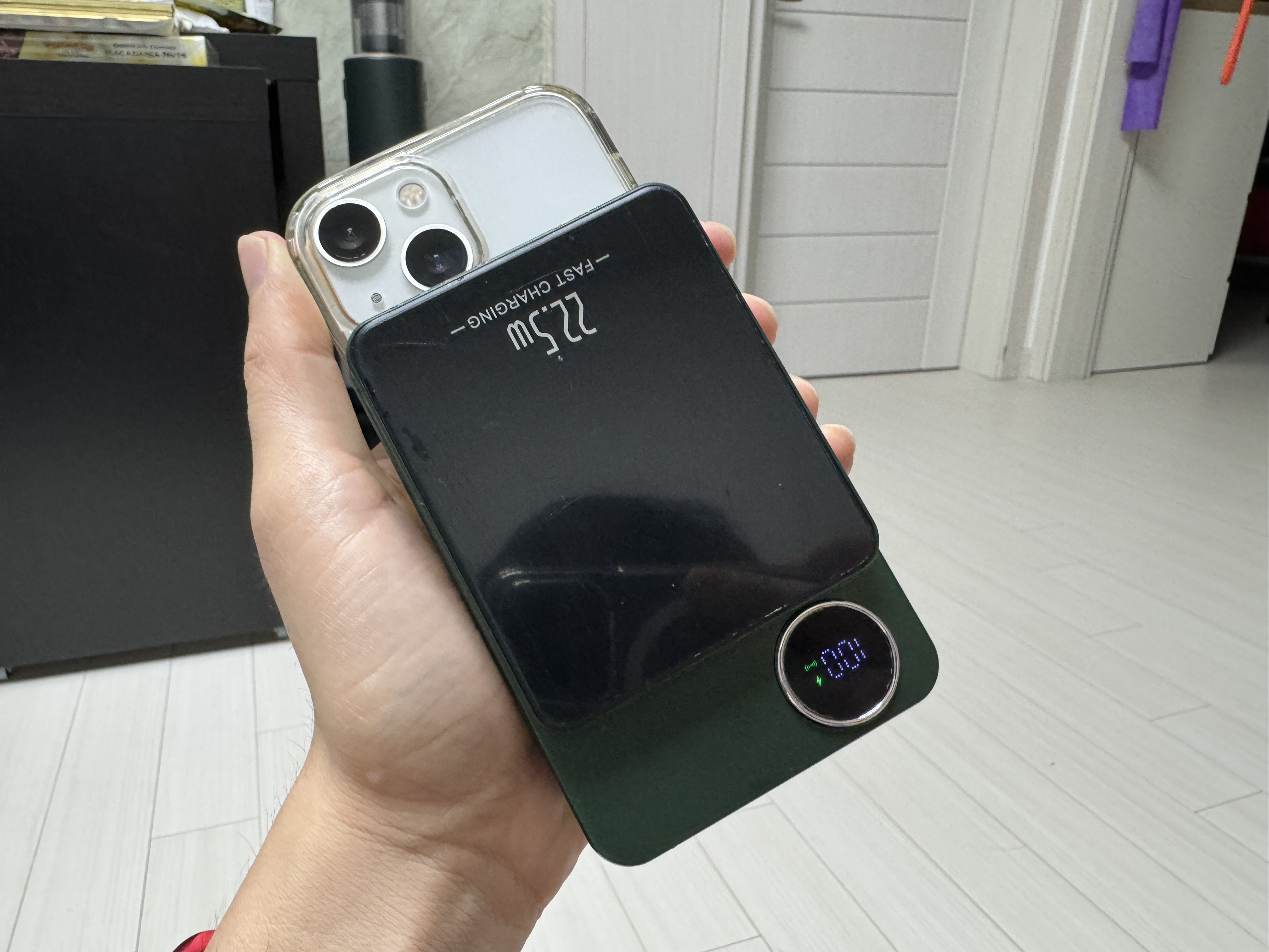 | 적당한 자력을 가진 맥세이프 모양의 자석 | 맥세이프 배터리인데 아이폰에서 고속 충전 불가능 |