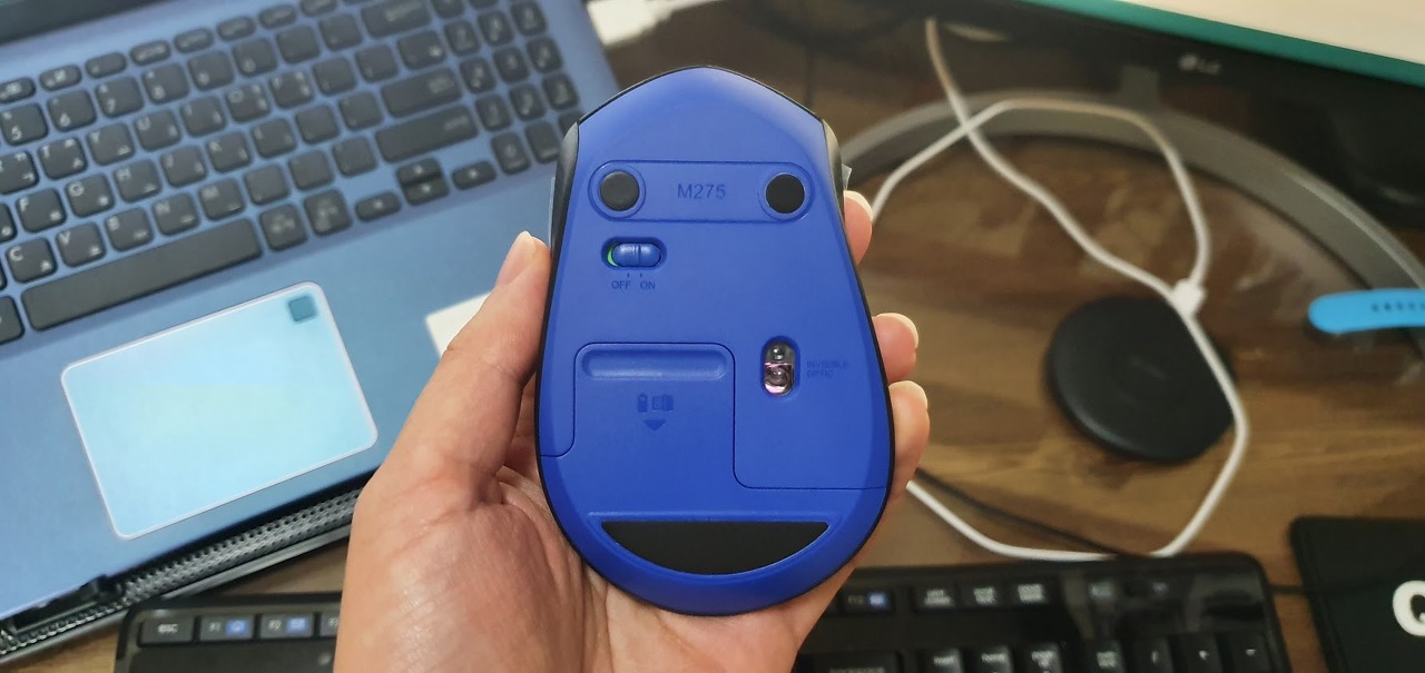 커버 내부. AA 건전지와 수신기 수납함이 있다. 참고로 마우스 크기가 작기 때문에, 손이 큰 남성의 경우에 추천하지 않는다. 나처럼 손이 작거나 여성의 경우에는 적당한 크기라고 말할 수 있다.