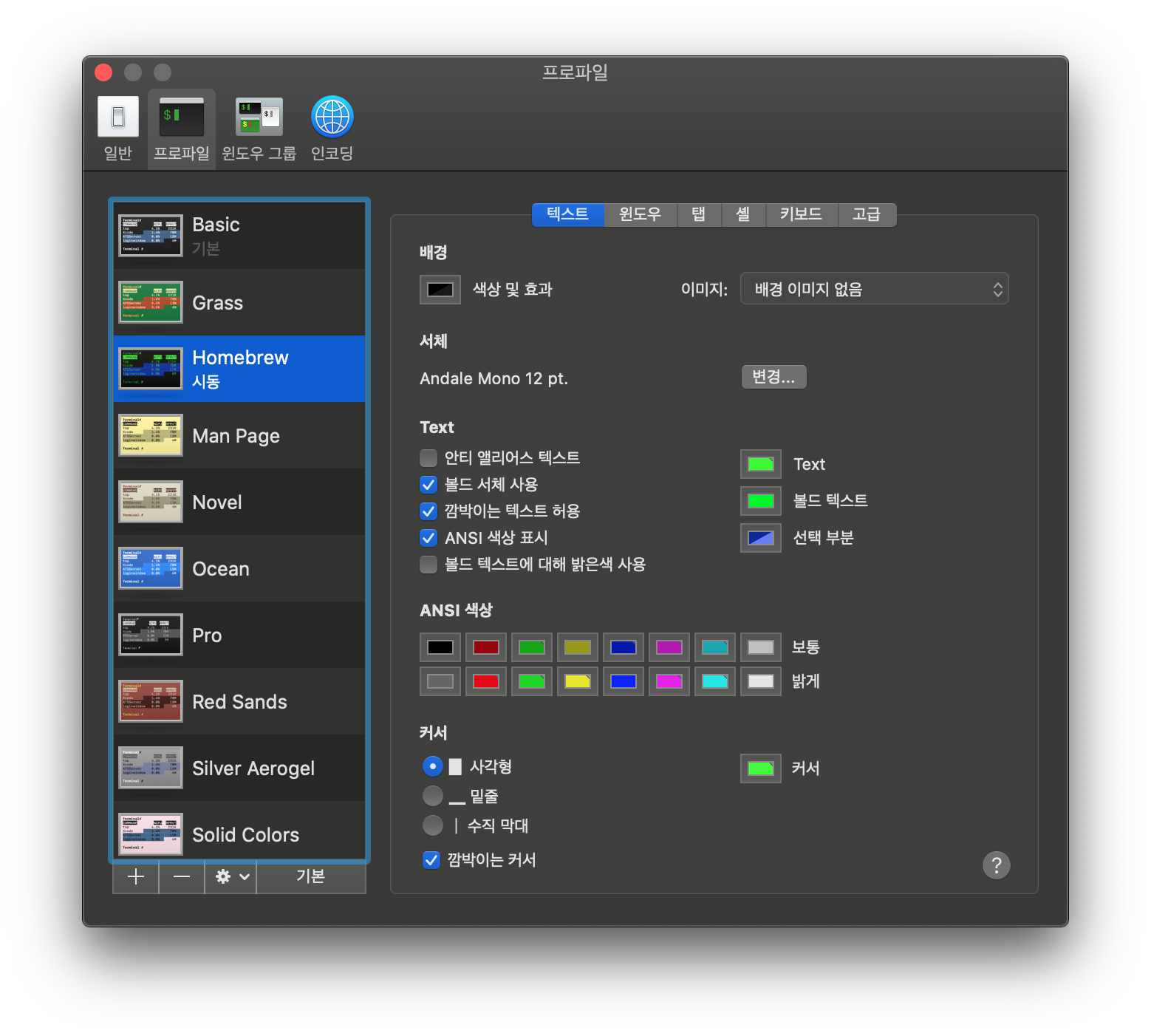 색상을 바꾸고 싶다면 프로파일에서 ANSI 색상을 변경하거나, 컬러 테마를 설치하고 적용하면 된다. 테마를 설치할 수 있는 또 다른 방법으로는 iterm2를 사용하는 방법이 있다. 방법은 위와 90% 이상 동일하기 때문에, 컬러셋을 좀 더 화려하게 바꾸고 싶다면 iterm2를 사용하고 나처럼 순정틱 하게 꾸미고 싶다 하면 이 게시글의 방법대로 설정하면 되겠다.