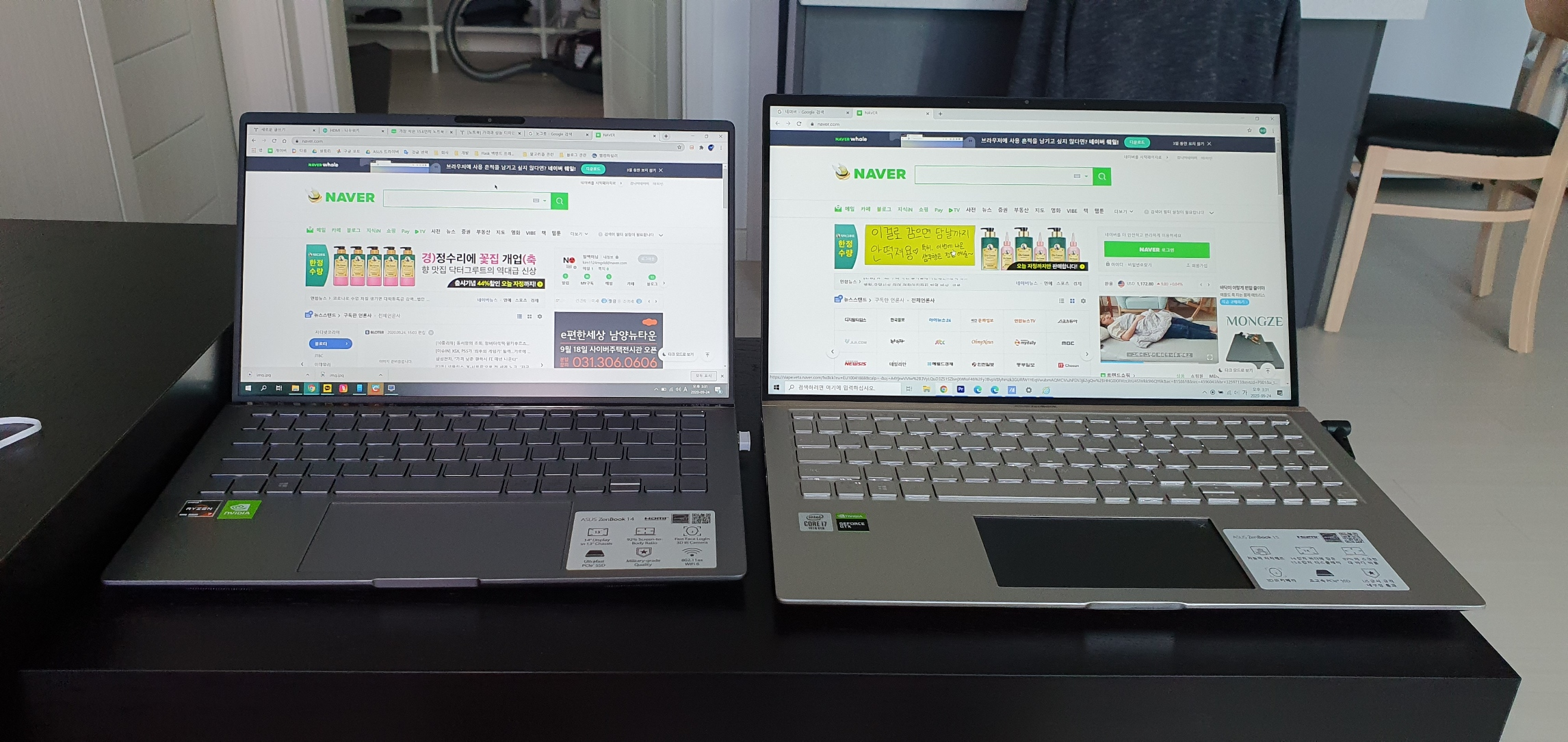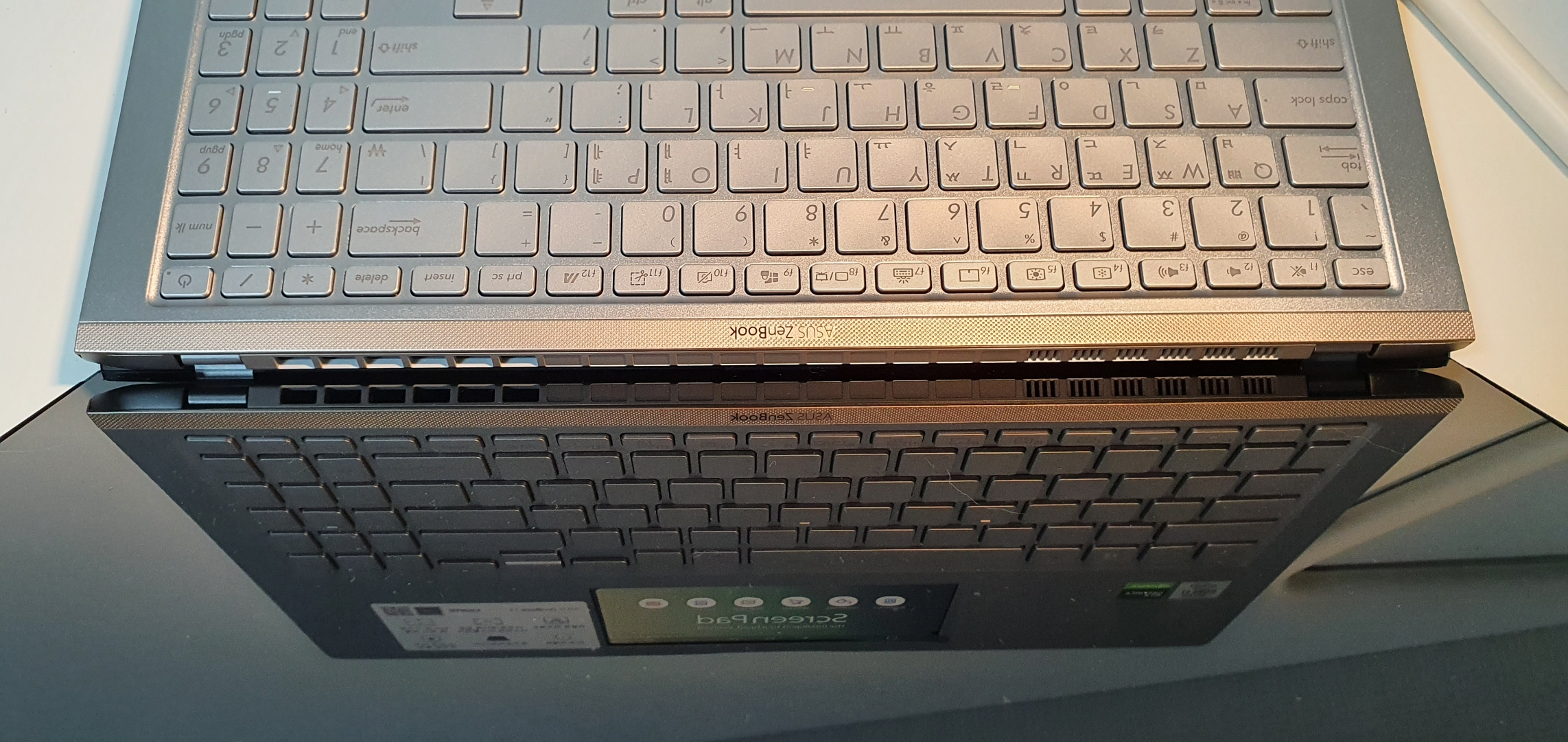 마지막으로 형제 젠북인 UM433IQ와의 비교 사진. 디자인 포인트가 비슷한 것 같으면서도 다른 게 재밌다.