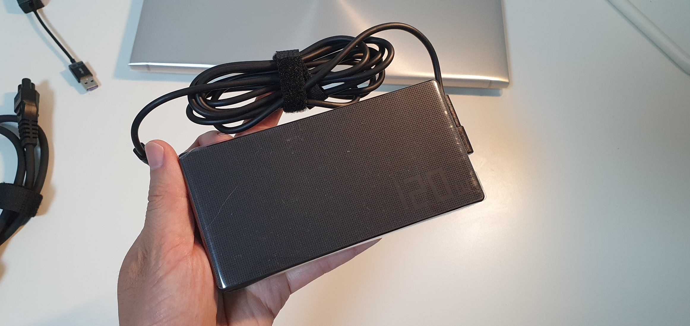 특이사항으로는 120W 고속 충전 어댑터가 있다. 외장 그래픽이 GTX1650이 탑재되어 고전력이 안정적으로 공급되야하기 때문에 용량이 매우 큰 어댑터를 사용한다.