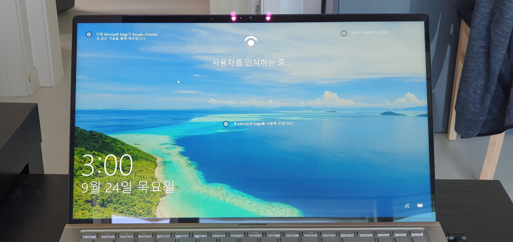 디스플레이는 글레어 타입이라 반사가 심해 밖에서는 제대로 사용하기는 힘들 것 같다. 디스플레이 테두리가 보호 유리 내부에 있어 마치 맥북을 보는 느낌이 든다. 카메라 구성은 양쪽 끝에 마이크와 IR 센서, HD 카메라로 구성된다.