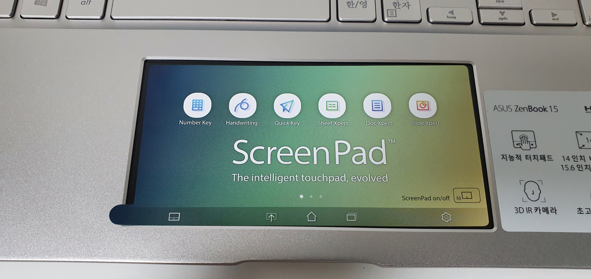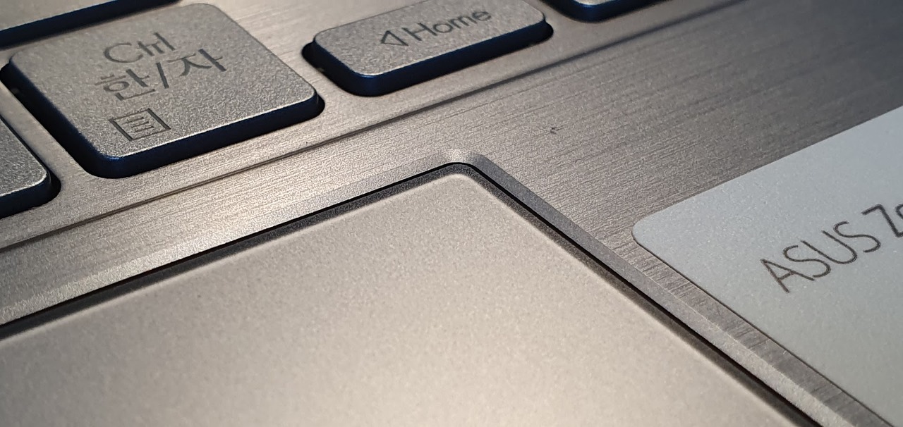 하판의 레이아웃은 좀 불편하다. 스크린 패드를 강조하기 위해 정가운데에 패드를 놓은 게 문제인 것 같다. UM433IQ처럼 숫자 키패드가 없으면 괜찮을지 몰라도, 숫자 키패드가 오른쪽에 있으면 아래와 같이 오른손으로 타이핑 시 스크린 패드에 간섭이 많이 일어난다.