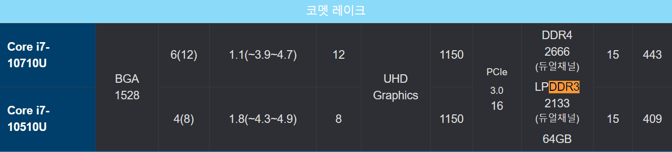 메인 메모리는 LPDDR3 2133 Mhz 듀얼 메모리로 사용한다. 여기서 잠깐 코멧 레이크의 CPU 스펙을 살펴보자.