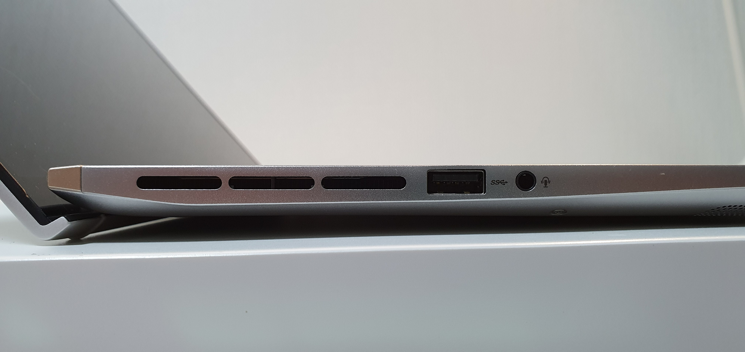 왼쪽 측면에는 배기구와 A타입 USB 포트, 입력 / 출력이 모두 되는 3.5mm AUX 단자가 있다.