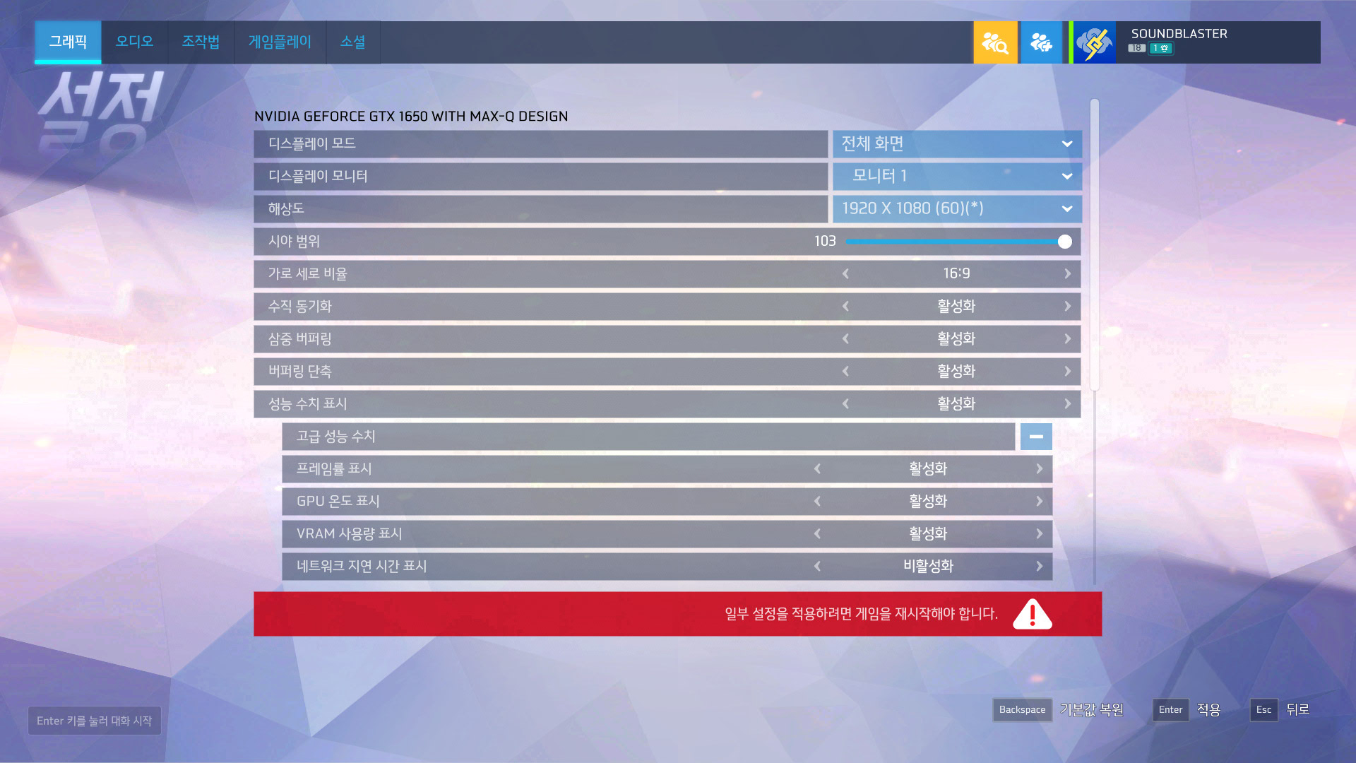 그래픽 설정은 최상 옵션으로 선택하고 부가적인 모든 옵션을 활성화시켰다.