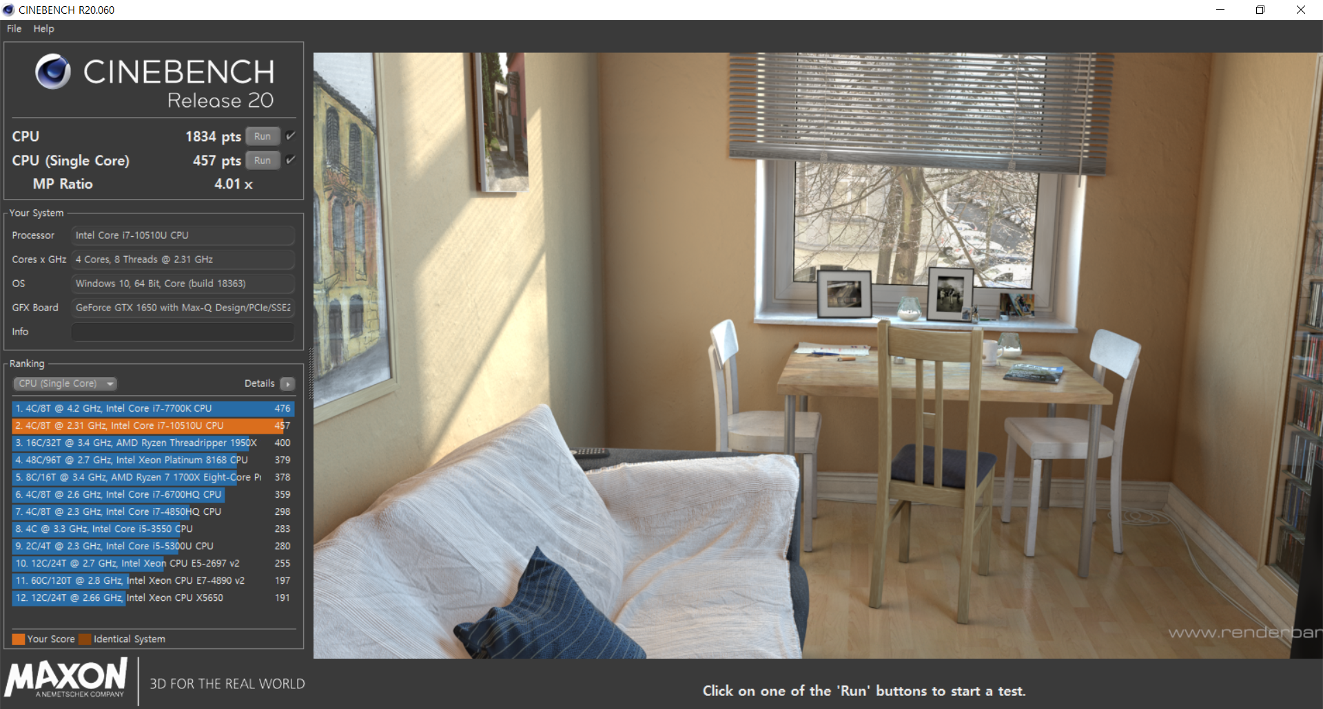순수하게 CPU 성능을 측정하는 시네벤치 20으로 성능을 측정했다.