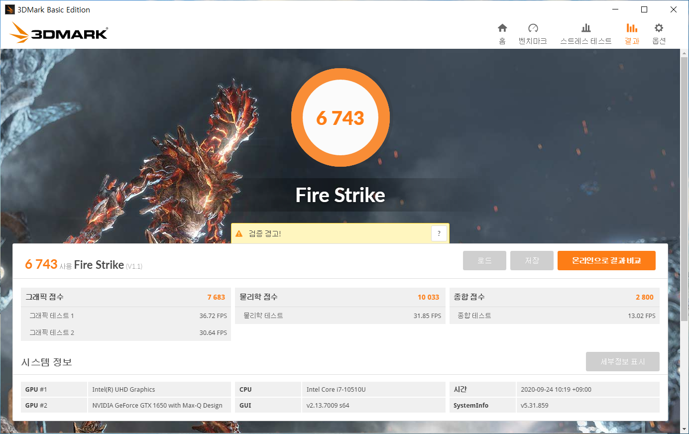 UX534FTC-A9085T에는 엔비디아 지포스 GTX1650 MAX-Q GDDR5 4GB 외장 그래픽이 탑재되어 있다. 3D Mark의 파이어 스트라이크로 측정한 결과는 아래와 같다.