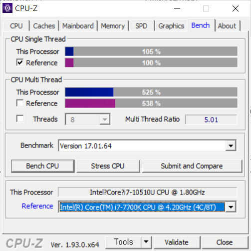 CPU-Z에서는 i7-7700K와 거의 동일한 성능을 보여주는 것으로 나타났다. 저전력 쿼드코어 프로세스임을 감안하면 충분히 좋은 성능이지만, 고성능을 요구하는 작업이 지속될 경우 쓰로틀링에 의한 성능 저하는 매우 아쉬웠다.