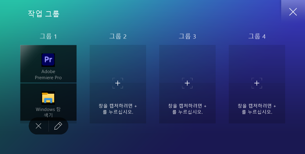 터치패드 오른쪽에 있는 아이콘을 터치하면 작업 그룹을 설정할 수 있는데 아래 사진과 같이 자주 사용하는 프로그램들을 그룹화할 수 있다.
