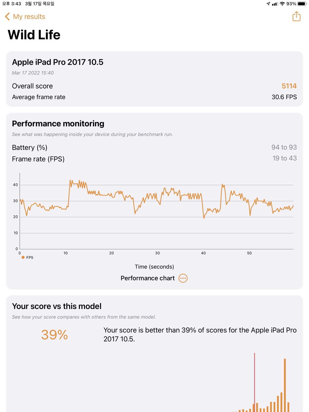 먼저, CPU의 연산 성능을 확인하는 긱벤치 결과이다. 싱글 코어 851점 멀티 코어 2315점으로 2019년에 출시한 갤럭시 S10의 엑시노스 9820보다 약간 더 높은 성능을 가지고 있음을 확인할 수 있다. 또한, 아이패드 OS의 버전이 5단계나 업그레이드 되었음에도 불구하고 버벅거림을 느끼기 어렵다는 점을 보면 A10X 퓨전 AP의 성능이 아직까지는 현역이라는 것을 알 수 있다.