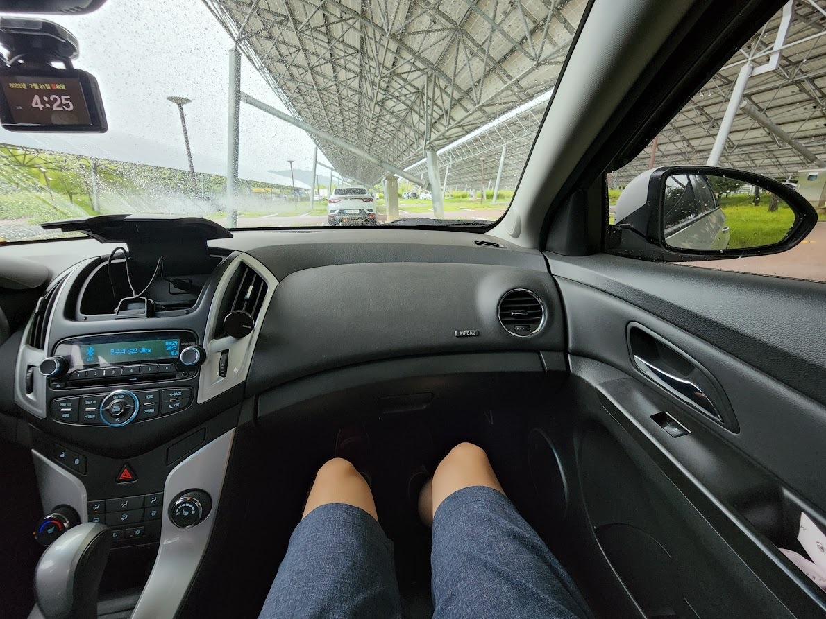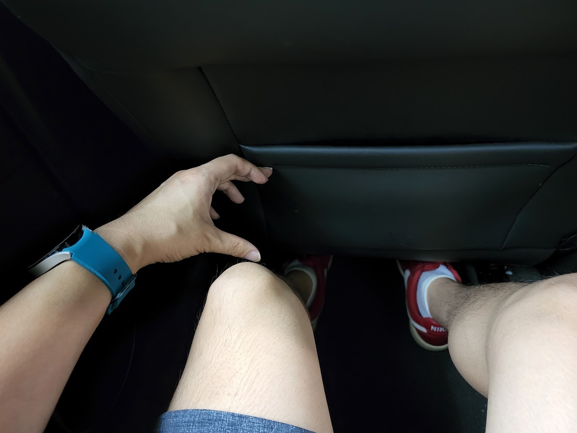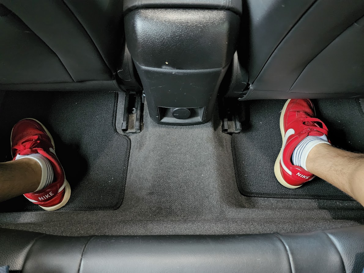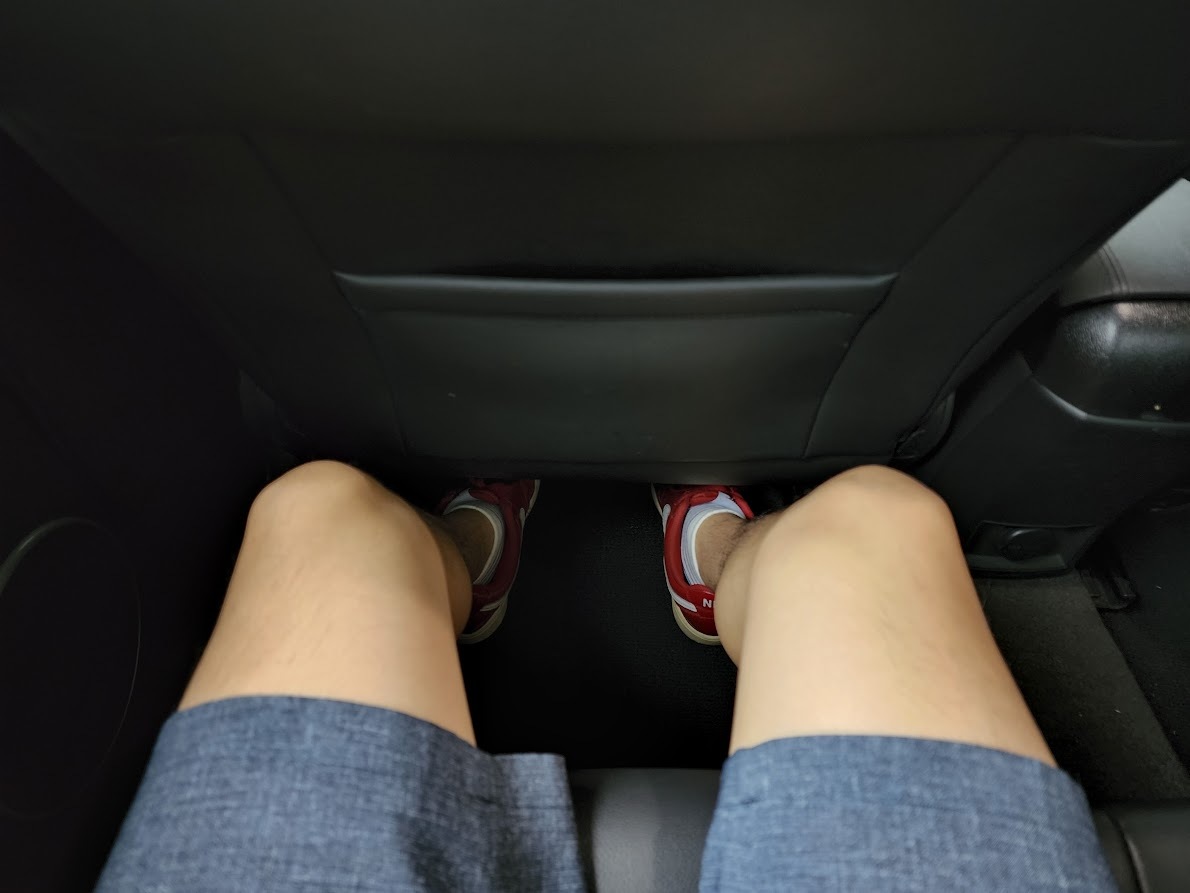 키 169cm 정도의 사람이 2열을 앉으면 그래도 어느 정도는 여유가 있다. 하지만, 2열 시트 방석이 너무 얇고 낮아서 허벅지가 붕 뜨는 듯한 느낌이 든다. 아래 사진과 같이 1열 시트 밑으로 발을 집어넣어야 허벅지가 방석에 밀착된다. 키가 큰 사람이라면 상당히 불편할 듯하다.