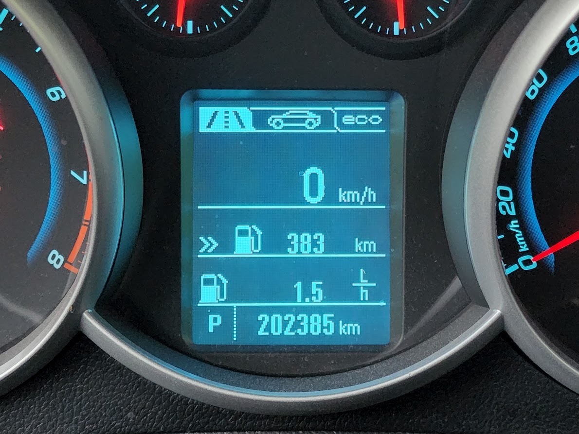 당시에 호평받았던 아이스 블루 조명의 계기판 사진. 직전에 탔던 트레일 블레이저의 디스플레이보다 더 많은 정보를 보여준다.