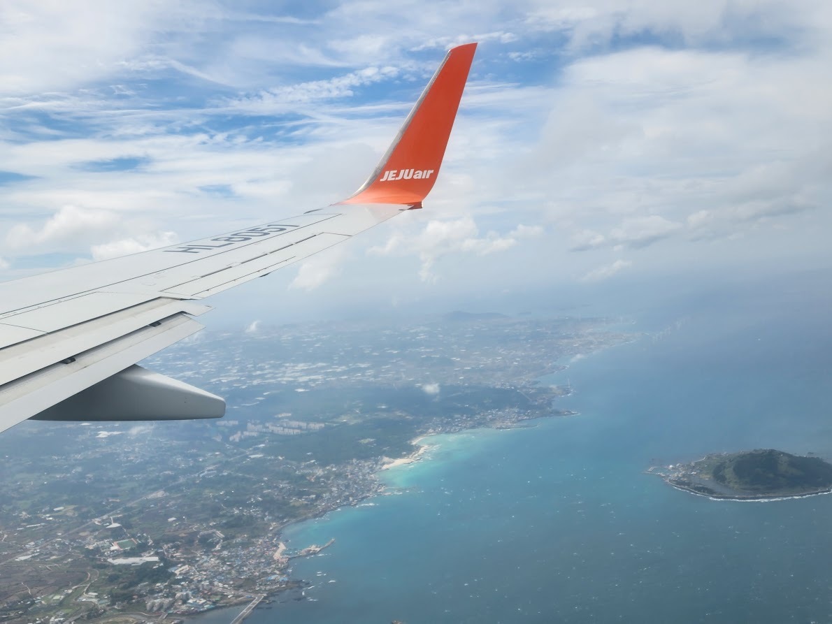 최대 고도로 비행 중일 때의 사진과 제주도에 근접했을 때의 사진. 날씨 예보에 분명히 제주도에 강풍과 비가 내린다고 했는데, 비행기에서 바라본 제주도의 날씨가 너무 좋아서 설레기 시작했다.