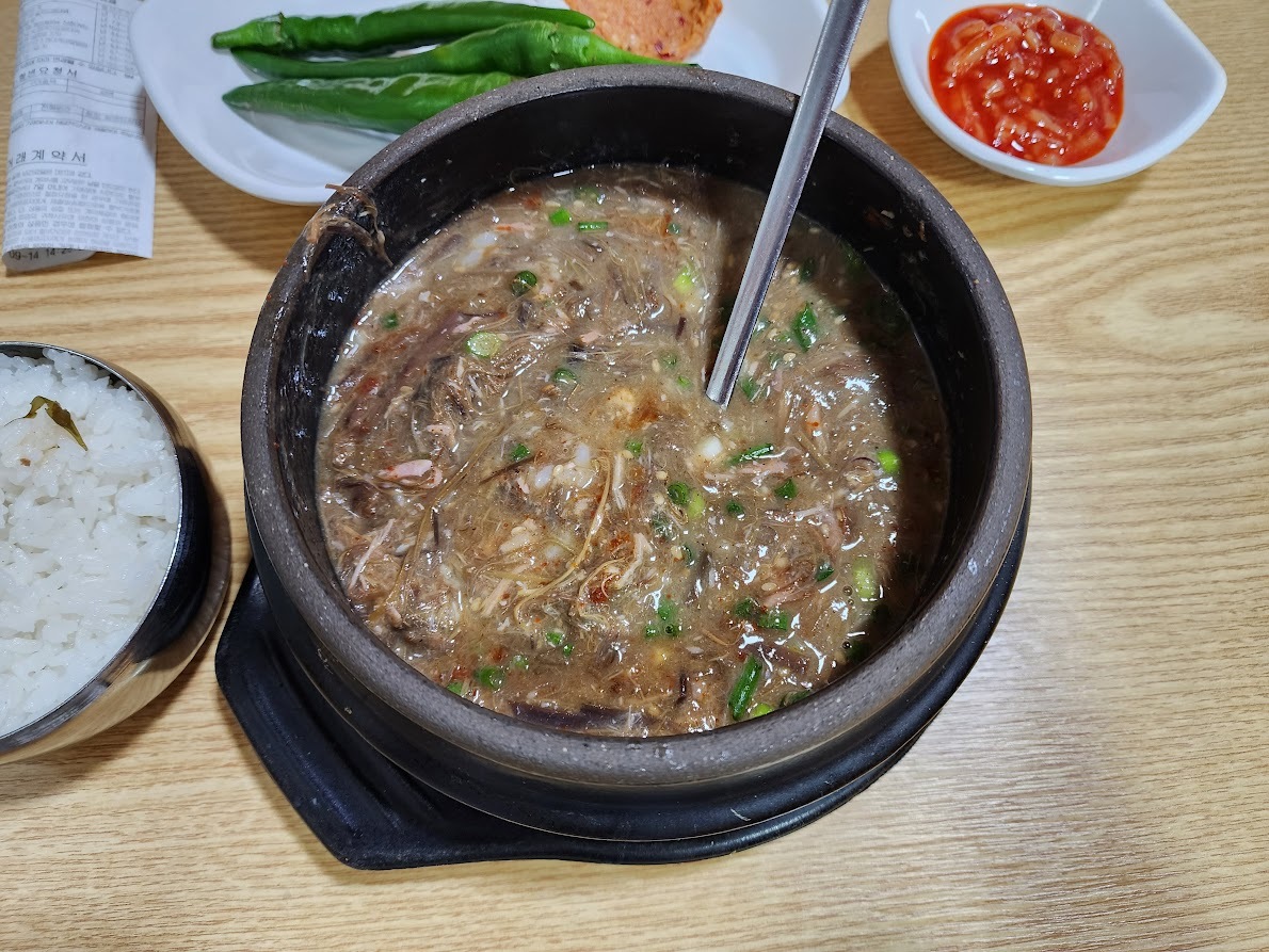 35분 정도 기다린 후 비교적 빠르게 입장한 우진 해장국. 우리는 고사리 해장국, 몸국, 녹두 빈대떡을 주문하였다.