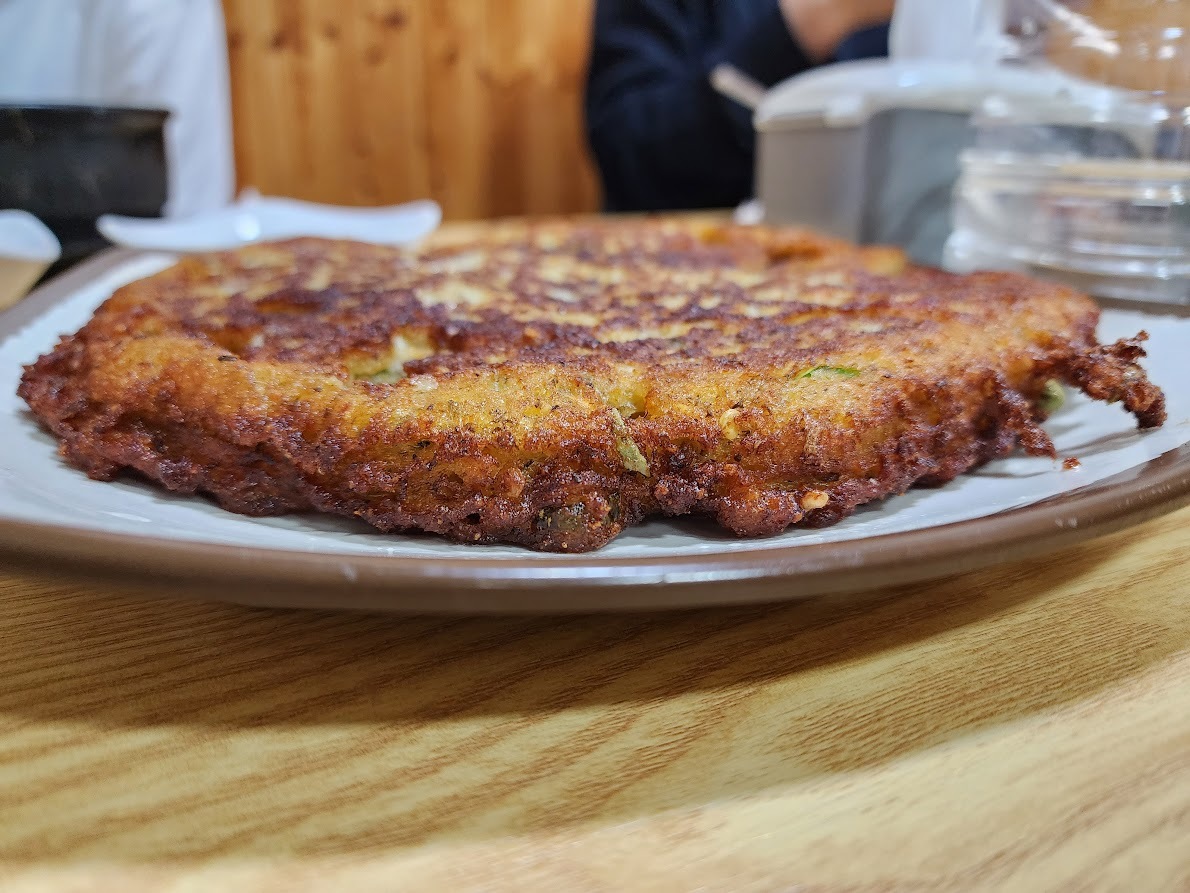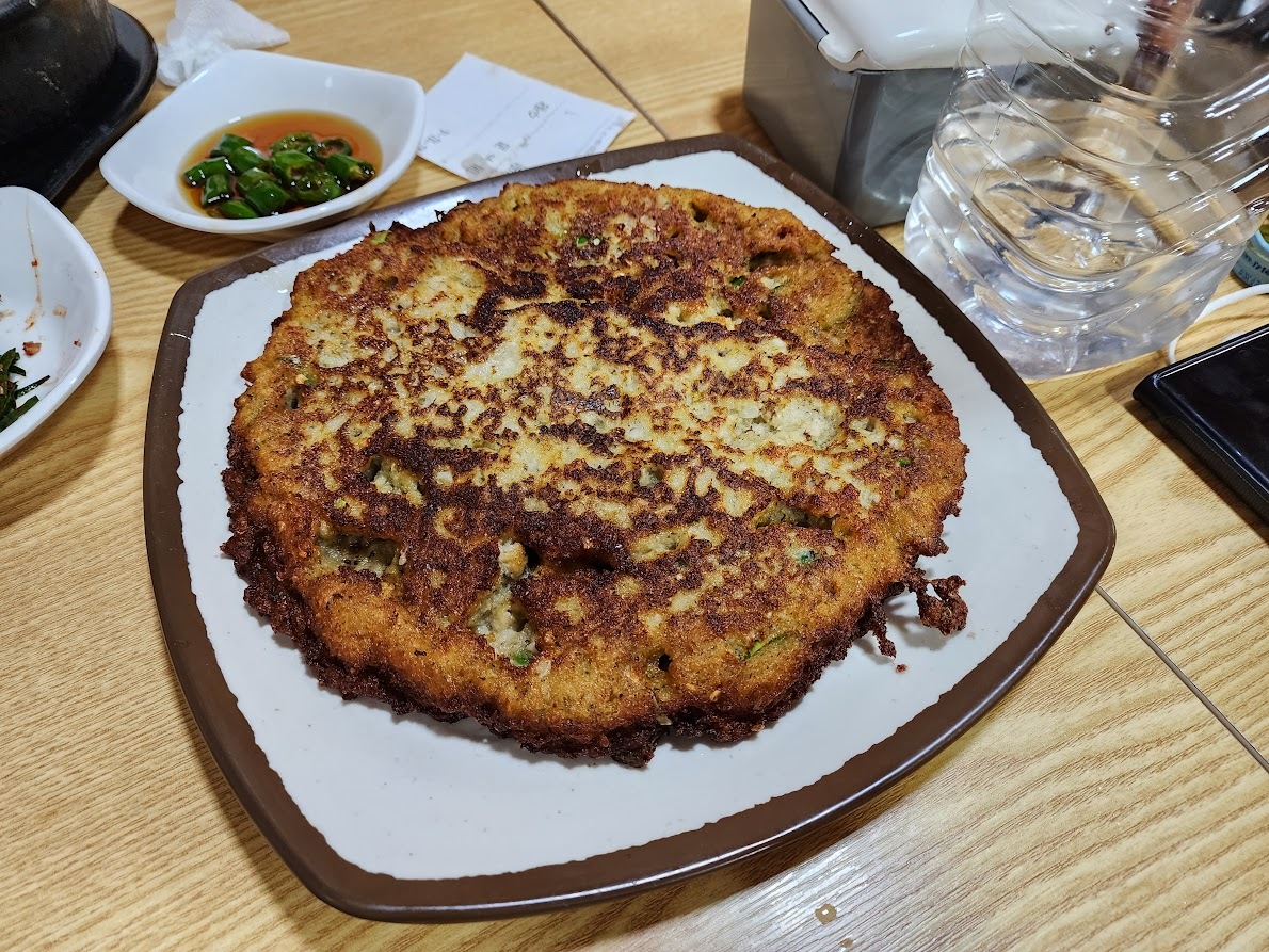녹두 빈대떡에는 제주도 흑돼지 고기가 들어간다고 한다. 밖은 바삭하고 안은 촉촉한 겉바속촉의 매력이 있는 전이다.